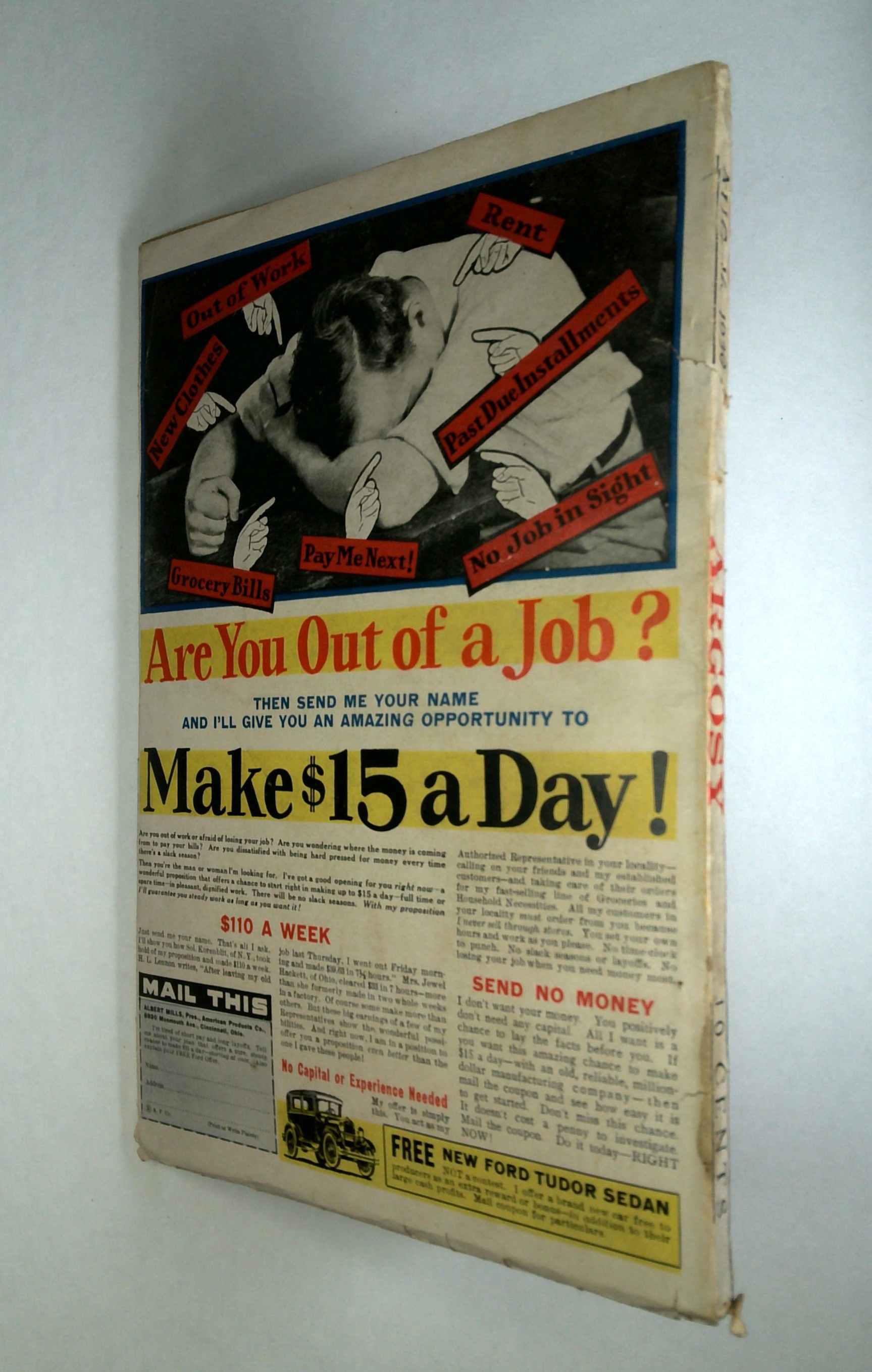 - Front cover detached 5%. Back cover detached 5%. Water damage: Moderate. Staple rust: Slight.