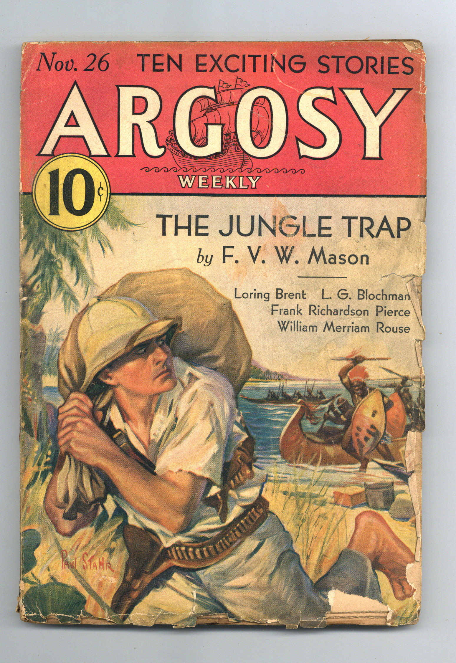 Contributors include F.V.W. Mason (part 1 of The Jungle Trap ), Loring Brent (part 2 of Sting of the Blue Scorpion ), Captain Dingle (part 4 of Sunken Dollars ), A. Merritt (conclusion of Burn, Witch, Burn! ), L.G. Blochman, John H. Thompson, William Merriam Rouse, Stookie Allen, Frank Richardson Pierce, & Jack Allman. Cover art by Paul Stahr. Cover price $0.10.