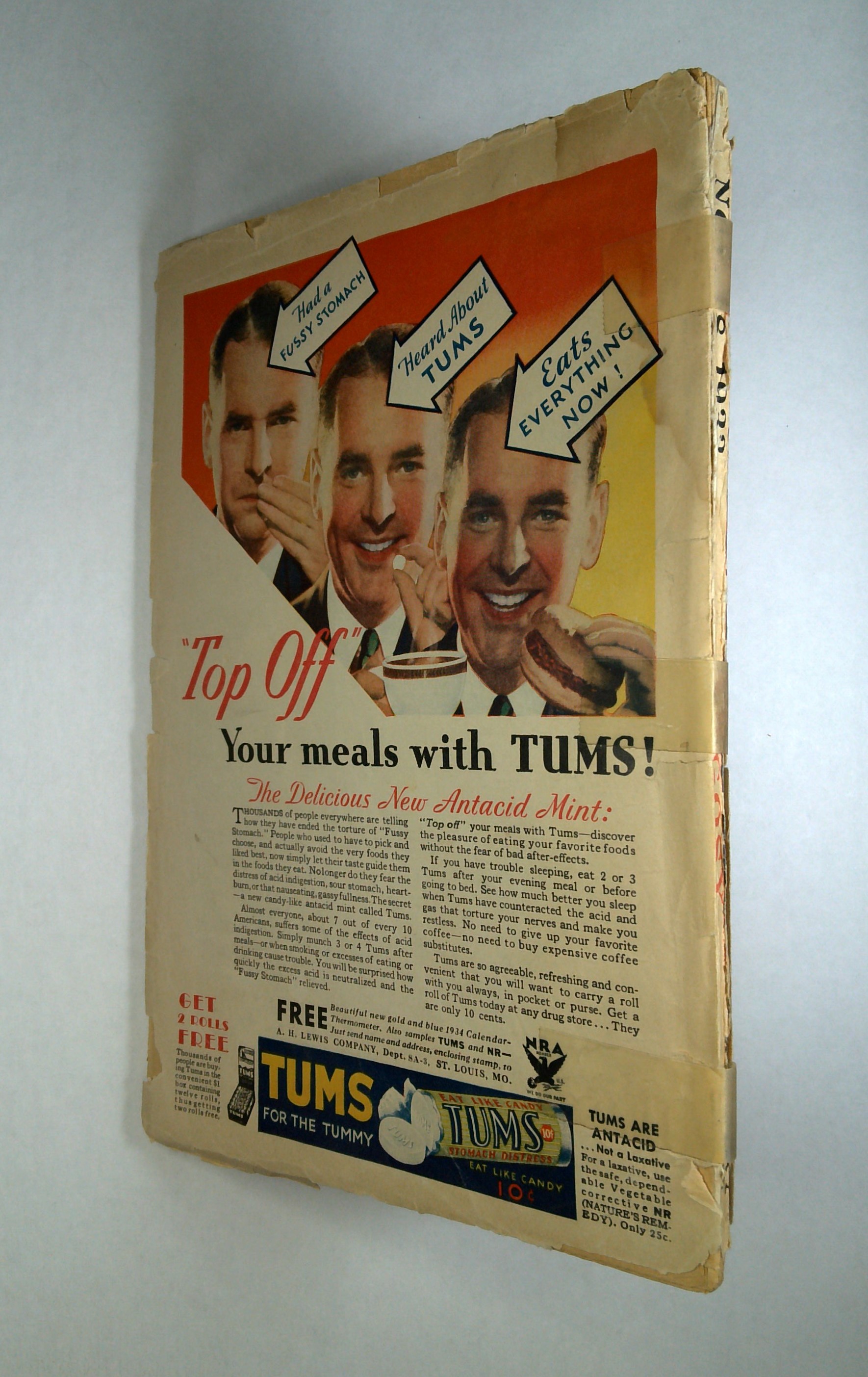 - Front cover detached 50%. Back cover detached 15%. Water damage: Moderate. Staple rust: Slight.