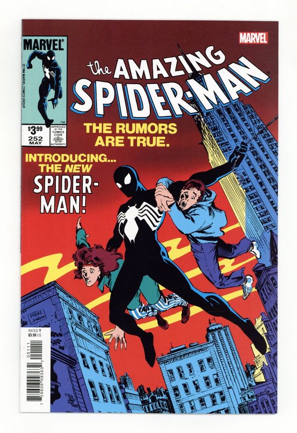 Written by Roger Stern and Tom DeFalco. Art and Cover by Ron Frenz. The stunning debut of Spider-Man's black suit - the alien costume that would one day become Venom! As Spidey makes his homecoming from the super hero Secret Wars, he returns with a miraculous new outfit, a striking black-and-white Spider-Man costume that morphs and responds to his very thoughts - allowing him to change back to Peter Parker at will! But is it possible that this miraculous article of alien clothing may have a mind of its own? With New Yorkers made uneasy by his new look and the Secret Wars photos he took far too alien to sell to the Daily Bugle, can Peter pick up the life he left behind? Relive the issue that set in motion the entire saga of Venom! It's one of the all-time great Marvel comic books, boldly re-presented in its original form, ads and all! 32 pages, full color. Rated T Cover price $3.99.