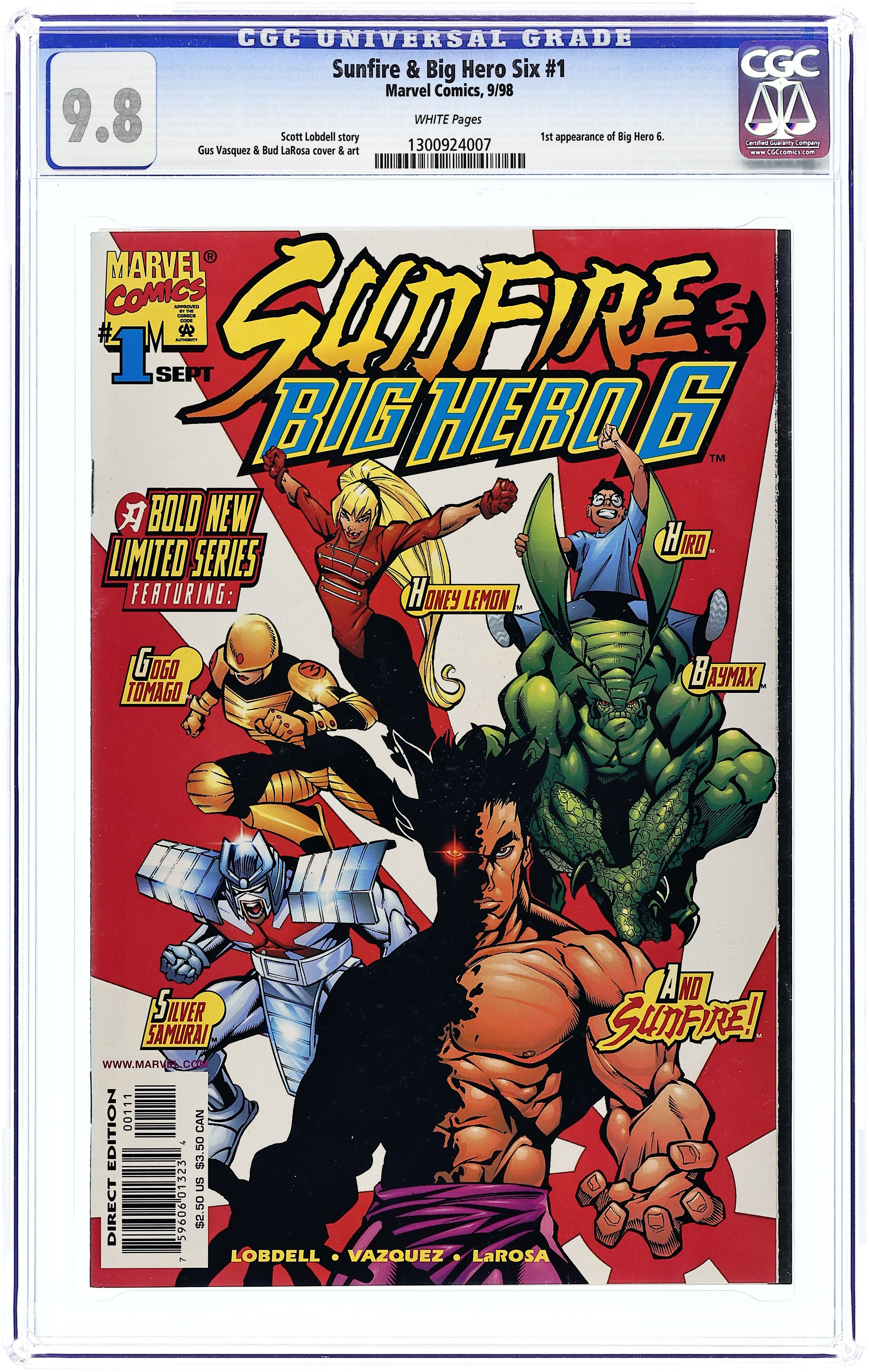 Cover pencils by Gus Vasquez, inks by Bud LaRosa. Land Of The Rising Sun [Part 1], script by Scott Lobdell, Steve Seagle (Story Idea), and Duncan Rouleau (Story Idea), pencils by Gus Vazquez, inks by Bud LaRosa; The U.S. have the Avengers, Canada has Alpha Flight and the Soviet Union has the Super Soldiers so Japan decides to form its own national superhero team, Big Hero 6, under the leadership of the Silver Samurai; Unfortunately, young genius Hiro's mother won't allow him to join; Hiro tracks down Sunfire only to learn that his idol's powers are quickly killing him; Big Hero 6 wants Sunfire to join but he claims that his hero days are over; Hiro returns home to find his mother gone and the villain, Everwraith, threatening to kill her unless Hiro and Baymax agree to work for him. 38 pgs. $2.50. Cover price $2.50.