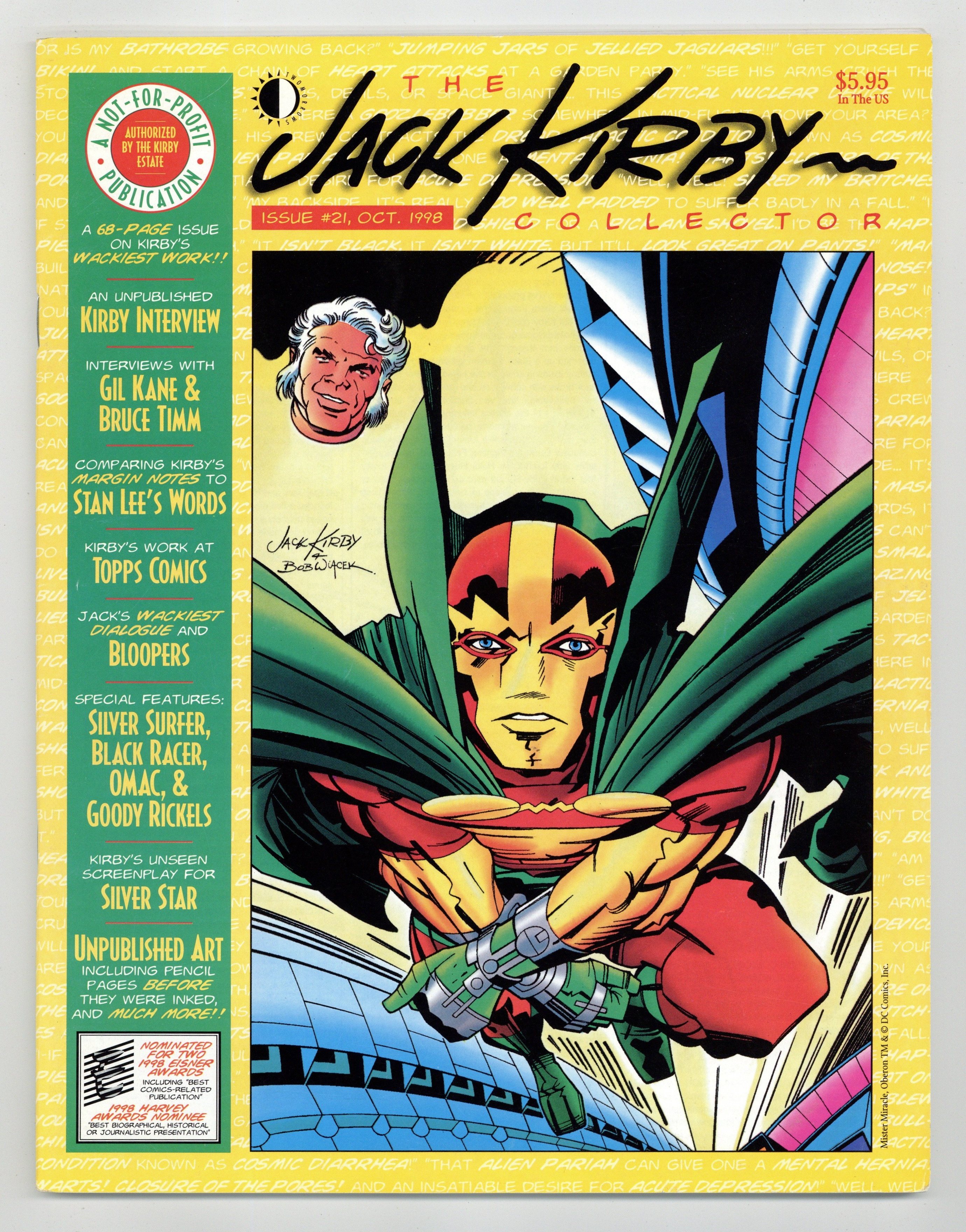 Tags: Jack Kirby Collector (part 21)Published Oct 1998 by TwoMorrows.$14.50An Unpublished Kirby Interview; Interviews with Gil Kane & Bruce Timm; Comparing Kirby's Margin Notes to Stan Lee's Words; Kirby's work at Topps Comics; Jack's Wackiest Dialogue & Bloopers; Special Features: Silver Surfer, Black Racer & Goody Rickels; Kirby's Unseen Screenplay for Silver Star; Unpublished Art including Pencil Pages Before They Were Inked and Much More!! Cover by Kirby & Bob Wiacek. Cover price $5.95.