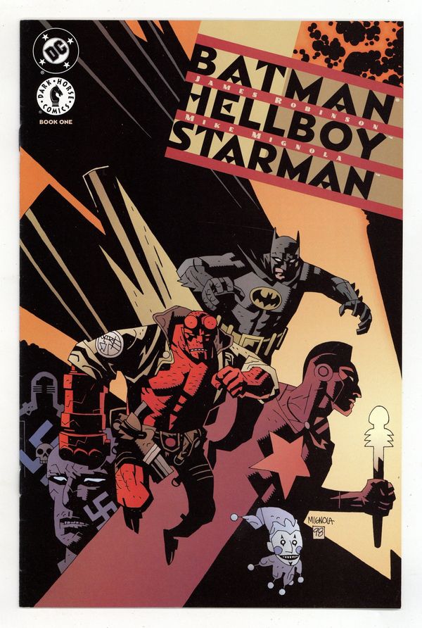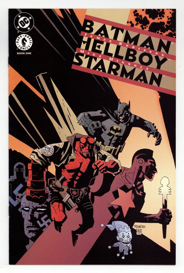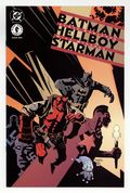 In one of the most unorthodox crossovers to date, DC's Dark Knight meets Mike Mignola's Hellboy! Ted Knight comes to Gotham City to lecture at a conference on alternative energies sponsored by Wayne Industries. But when Knight is kidnapped by a group of magic-wielding Nazis called the Knights of October, Hellboy offers his aid to Batman to help find Ted and thwart the Knights of October in their plans to marshal the Golden Age Starman's knowledge for their own nefarious purposes. As the heroes track the kidnappers--and their victim--to the Amazon jungle, they'll need some additional help: from Ted Knight's son Jack, Starman. Co-published with Dark Horse Comics. No interior ads. Written by James Robinson. Art and cover by Mike Mignola. FC, 32 pg. Cover price $2.50.