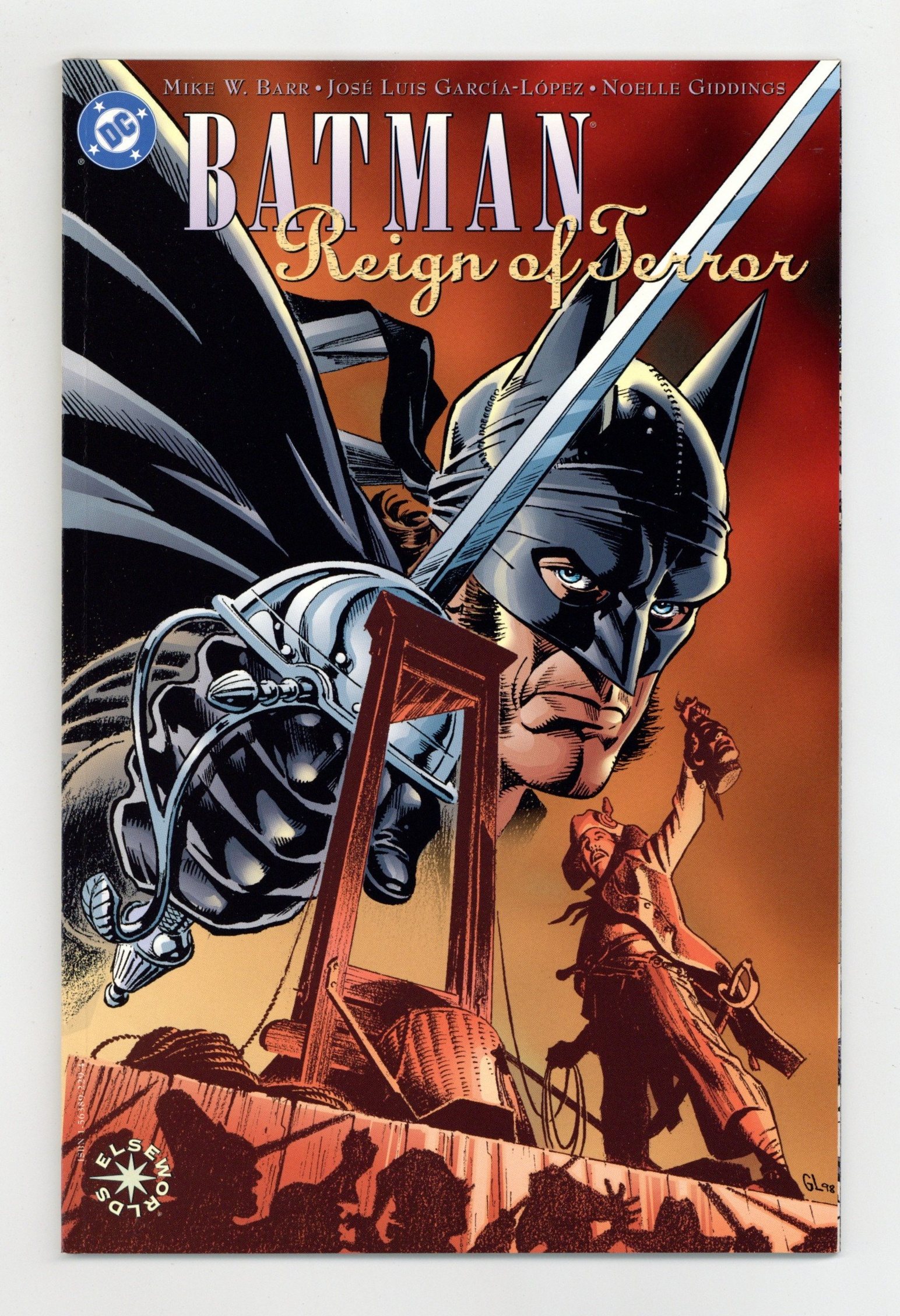 Elseworlds. Captain Bruce Wayne becomes the rogue masked defender of the innocent by night, battling the very revolution he defends by day. This sweeping adventure pits a dashing Dark Knight against the war-scarred political mastermind Herve Deinte! Script by Mike W. Barr, art & cover by Jose Luis Garcia-Lopez. Cover price $4.95.