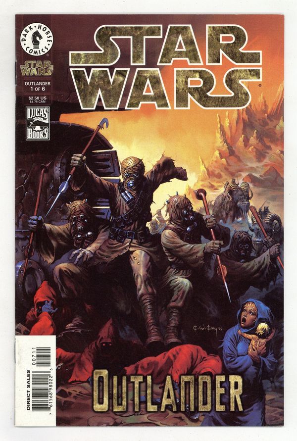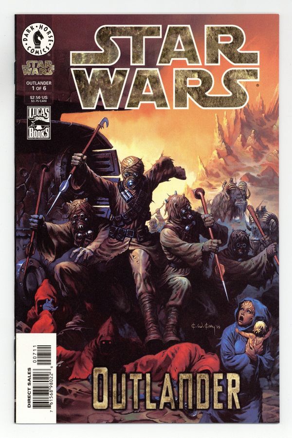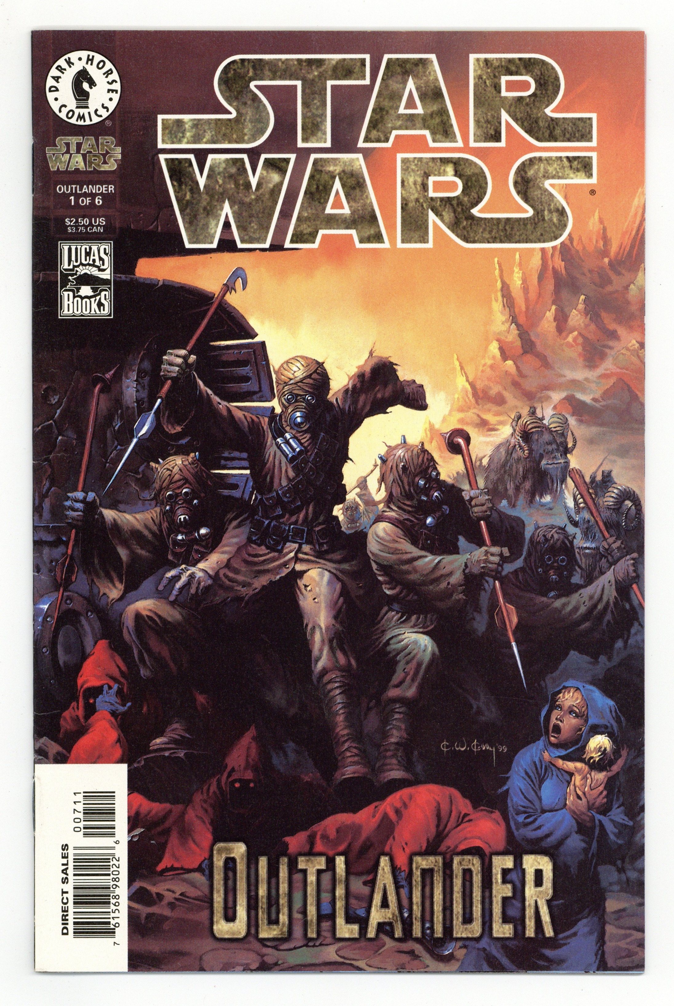Tags: Star WarsPublished Jun 1999 by Dark Horse.$20.00Outlander #1 by Timothy Truman, Tom Raney, and Mark Lipka; cover by Ken Kelly Don¹t miss the explosive first installment of ³The Outlander²! Ki-Adi-Mundi¹s first assignment after joining the Jedi Council will take him back to the fearsome deserts of Tatooine! The Jedi Council has tracked a long-wayward and powerful Jedi to the backwater world, and it¹s up to Ki to find him and convince him to return. Unfortunately, not only does he not want to return, but a powerful enemy has the Jedi in her sights, and a blaster bolt can travel a long way across the desert flats of Tatooine! On sale June 16 FC, 32pg$2.50" Cover price $2.50.