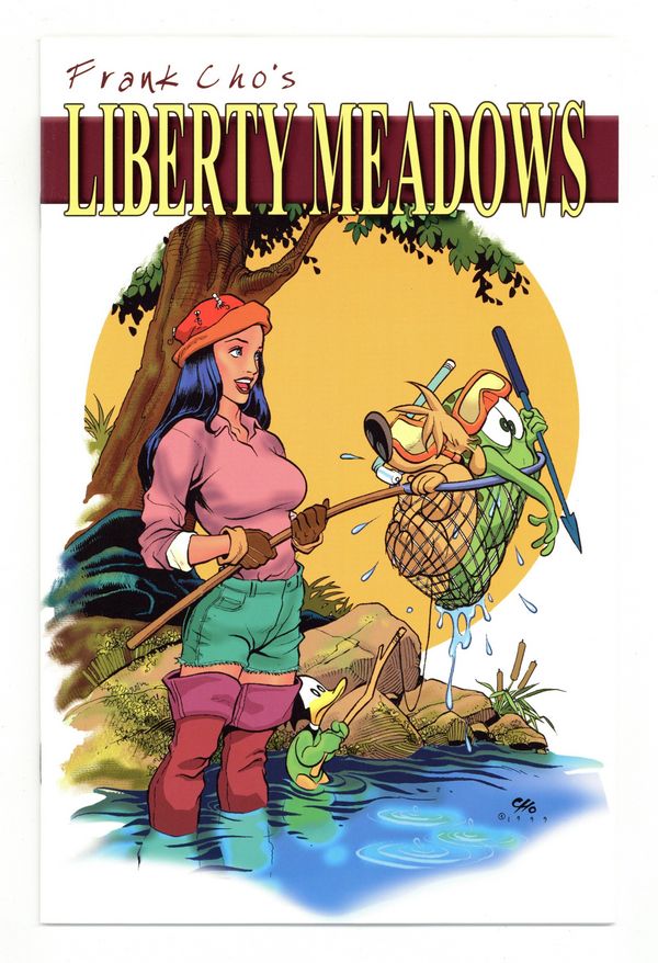 Published Aug 1999 by Insight Studios.$13.50by Frank Cho WARNING: If you read your comic books during your average stay on the can, then be aware that Liberty Meadows packs 48 daily laughs and eight Sunday howls into a single issue! Consult your doctor; you may require additional oxygen and muscle relaxants. Under prolonged use, Liberty Meadows has proven to be highly addictive in millions of willing test subjects around the world. New cover by Frank Cho. Every bathroom deserves one! Bimonthly." Cover price $2.95.