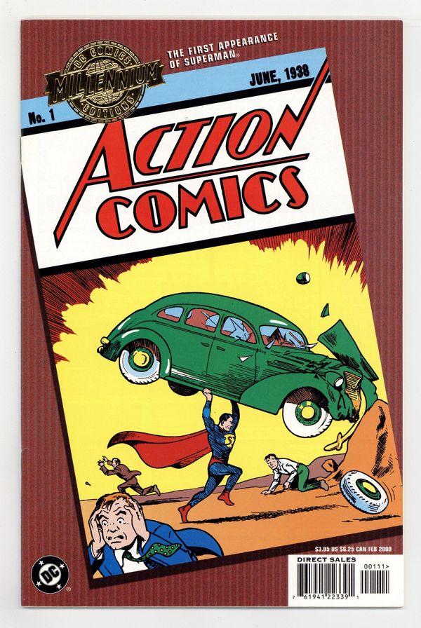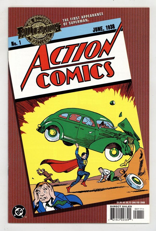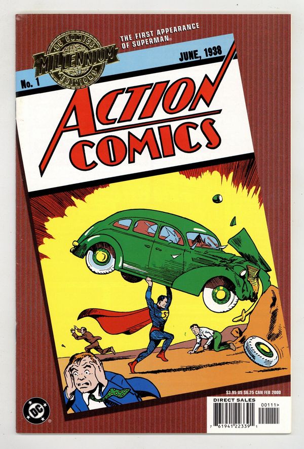 Cover art Joe Shuster. Written by Jerry Siegel, Fred Guardineer, Bernard Baily, and others. Art by Joe Shuster, Bailey, Will Ely, Guardineer, Sven Elven, H. Fleming, and others. The first appearances of Superman, Lois Lane and Zatara the magician are just some of the stories featured in this reprint of 1938's ACTION COMICS #1, one of the most important comics of all time. FC, 64 PG" Cover price $3.95.