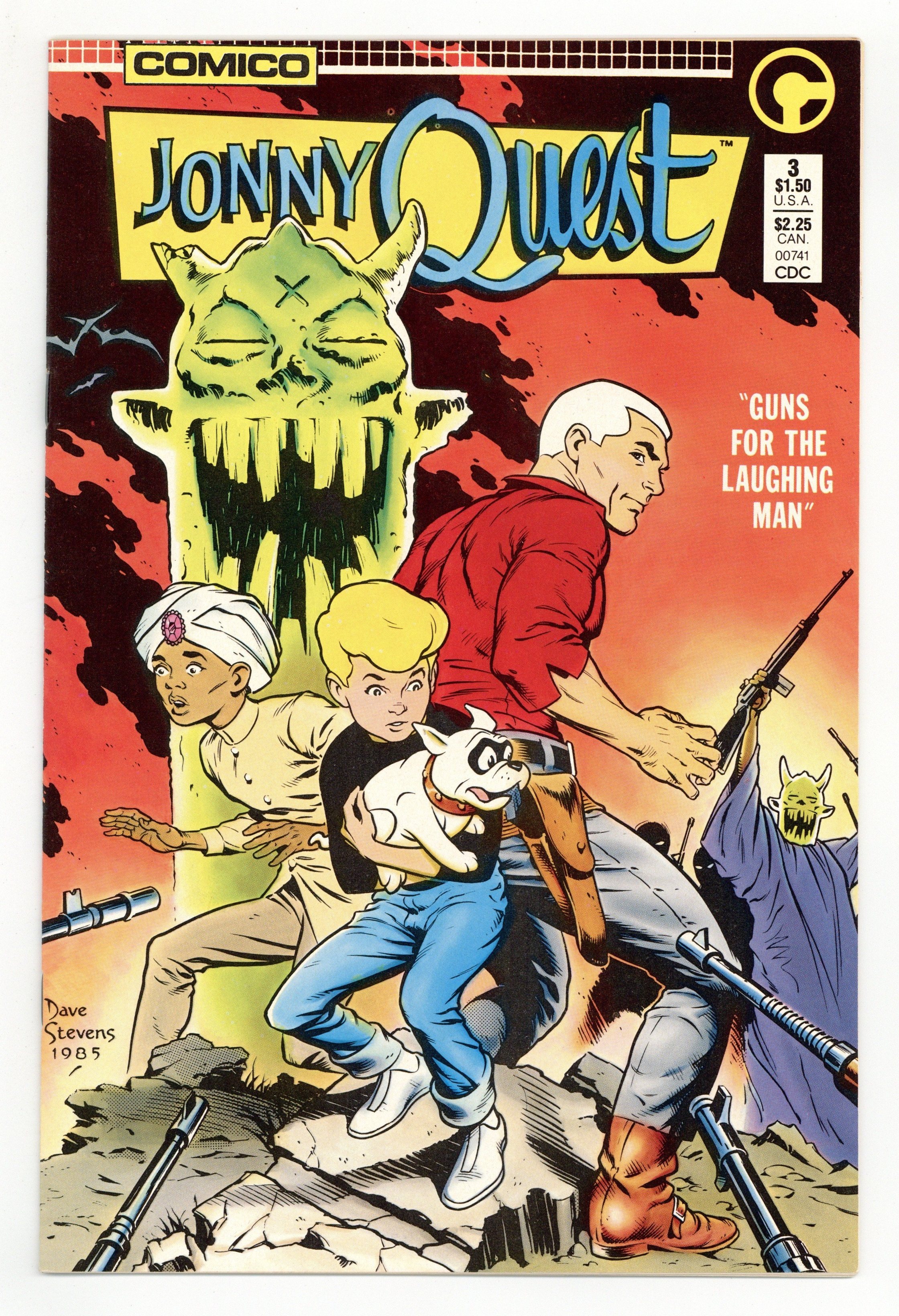 Jonny, Dr. Quest, Race and Hadji discover that no one is who they seem to be when they are summoned to South America to try to stop the flow of weapons to some revolutionaries in "Guns for the Laughing Man." Script by William Messner-Loebs and art by Marc Hempel & Mark Wheatley. Cover by Dave Stevens. Jonny Quest pinup on back cover. Cover price $1.50.