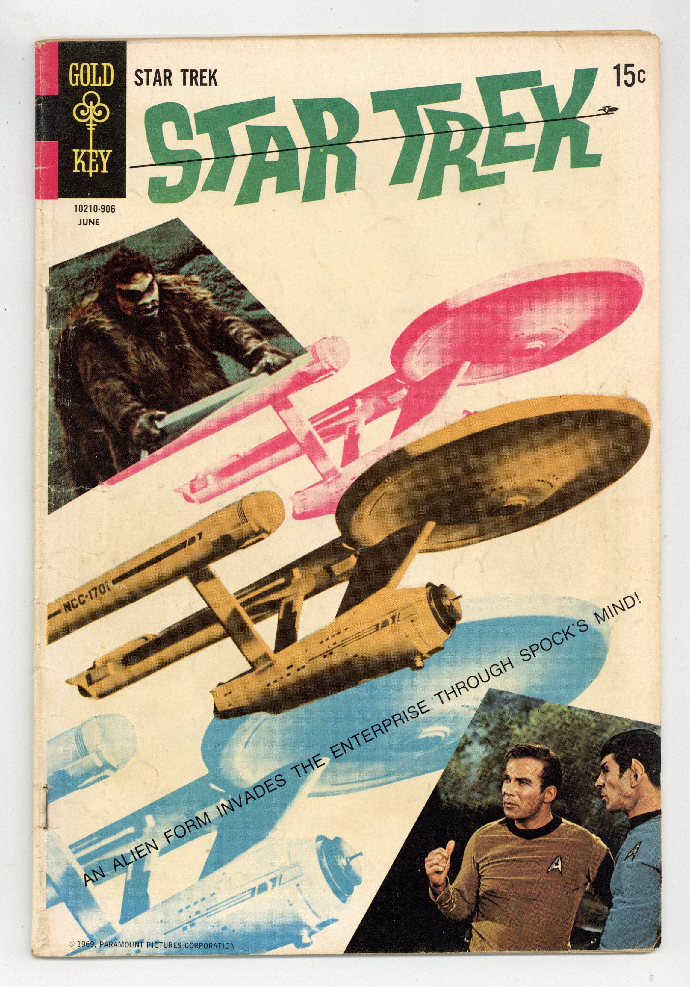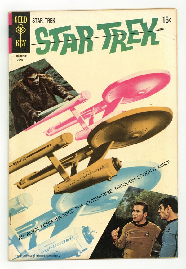 Comic book version of the original Star Trek TV series that starred William Shatner and Leonard Nimoy. 10210-906. Photo cover of William Shatner as Kirk, Leonard Nimoy as Spock, unidentified actor as an alien, and the USS Enterprise. "The Peril of Planet Quick Change, Part I: The Creatures of Light," script by Dick Wood, art by Alberto Giolitti; "The Peril of Planet Quick Change, Part II: The Sinister Guest," script by Dick Wood, art by Alberto Giolitti; A planet is continually changing its dynamic makeup; Spock is also taken over by some of the very spirits of the aliens; The whole Enterprise Crew works hard to stabilize the planet led by Spock under control of the aliens; This is kept from everyone and Spock finds later that he is unable to act independently from the alien control. Gold Key Comics Club News. 36 pgs., full color. $0.15. Cover price $0.15.