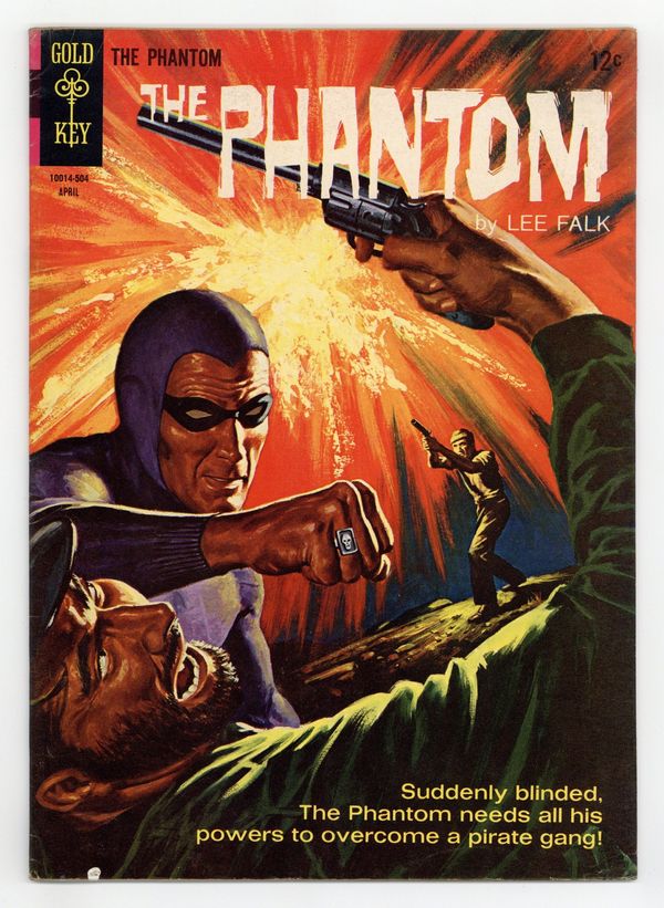 Painted cover art by George Wilson. "Bridges and Man, Number 3: Early Cantilever Bridges" Keys of Knowledge page, art by Joe Certa. "Blind Man's Bluff," art by Bill Lignante; When the Phantom confronts escaped convicts rendezvousing with pirates, he is blinded by a signal flare; Pirates track him as he struggles homeward guided by Devil and Hero, but at last he falls into quicksand; He has almost given up when the Bandar arrive to rescue him, led by Hero. "The Cave of Kings, Part II," art by Bill Lignante; The three friends find bullets useless against the monster, and attack it with dynamite; The blast blows them into an underground river from which they only narrowly escape. Statement of ownership--average print run 365,194; average paid circulation 235,500. Number on cover 10014-504 April. 36 pgs., full color. Cover price $0.12.