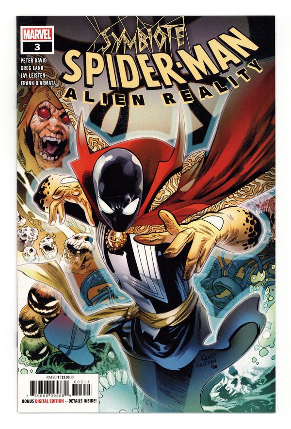 Written by Peter David. Art and Cover by Greg Land. PETER PARKER: THE SPIDER SUPREME?! After reliving one of the most horrible moments of his life, Peter Parker turns to one of his oldest allies for a magical helping hand. Don't miss the next history-shaking adventure of Peter David and Greg Land's landmark SYMBIOTE SPIDER-MAN Series! 28 pages, full color. Rated T Cover price $3.99.
