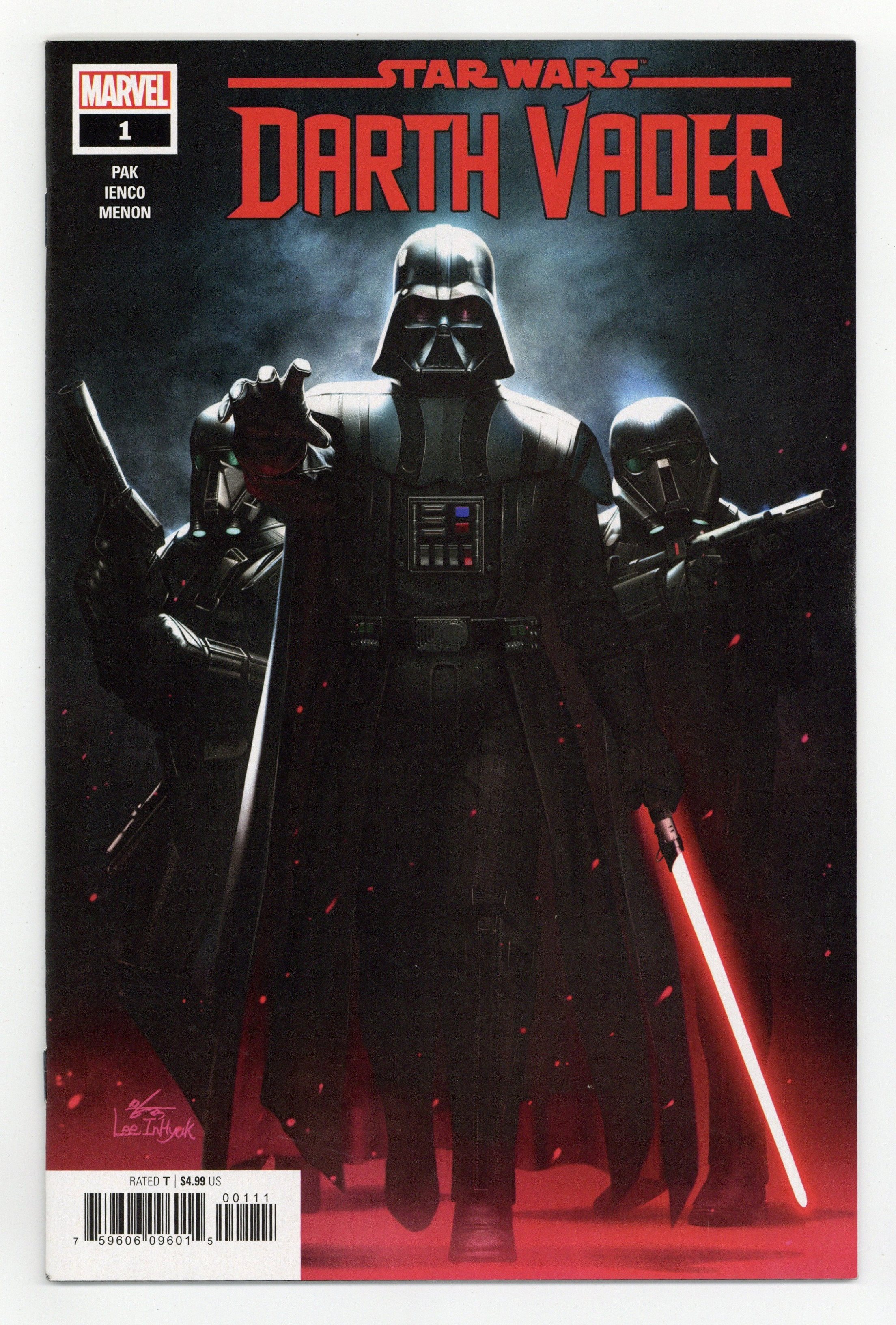 Written by Greg Pak. Art by Raffaele Ienco. Cover by In-Hyuk Lee. 'JOIN ME, AND TOGETHER, WE CAN RULE THE GALAXY AS FATHER AND SON!' THE TRAGEDY OF DARTH VADER CONTINUES! In the shattering climax of The Empire Strikes Back, Darth Vader infamously reveals his true relationship to Luke Skywalker and invites his son to rule the galaxy at his side. But Luke refuses -- plunging into the abyss beneath Cloud City rather than turn to the Dark Side. We all remember Luke's utter horror in this life-altering moment. But what about Vader? In this new epic chapter in the Darth Vader saga, the dark lord grapples with Luke's unthinkable refusal and embarks on a bloody mission of rage-filled revenge against everything and everyone who had a hand in hiding and corrupting his only son. But even as he uncovers the secrets of Luke's origins, Vader must face shocking new challenges from his own dark past. Writer Greg Pak and artist Raffaele Ienco unleash Darth Vader on his dark quest of vengeance and discovery this February! With covers by InHyuk Lee! 52 pages, full color. Rated T Cover price $4.99.