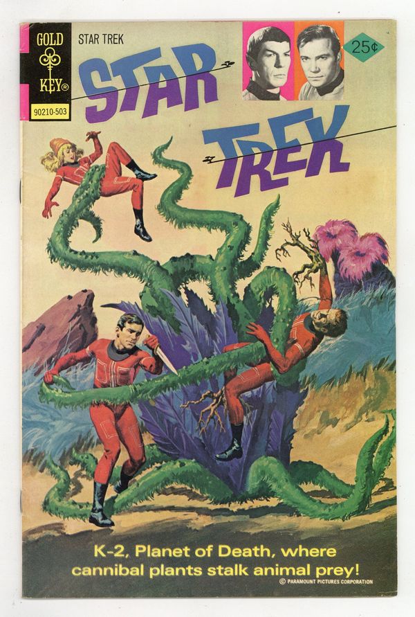 Comic book version of the original Star Trek TV series that starred William Shatner and Leonard Nimoy. 90210-503. Painted cover by George Wilson, with inset photos of William Shatner as Kirk and Leonard Nimoy as Spock. "The Planet of No Return," script by Dick Wood, art by Nevio Zaccata; the Enterprise crew is on K-2, Planet of Death, where cannibal planets stalk animals. 36 pgs., full color. $0.25. Cover price $0.25.
