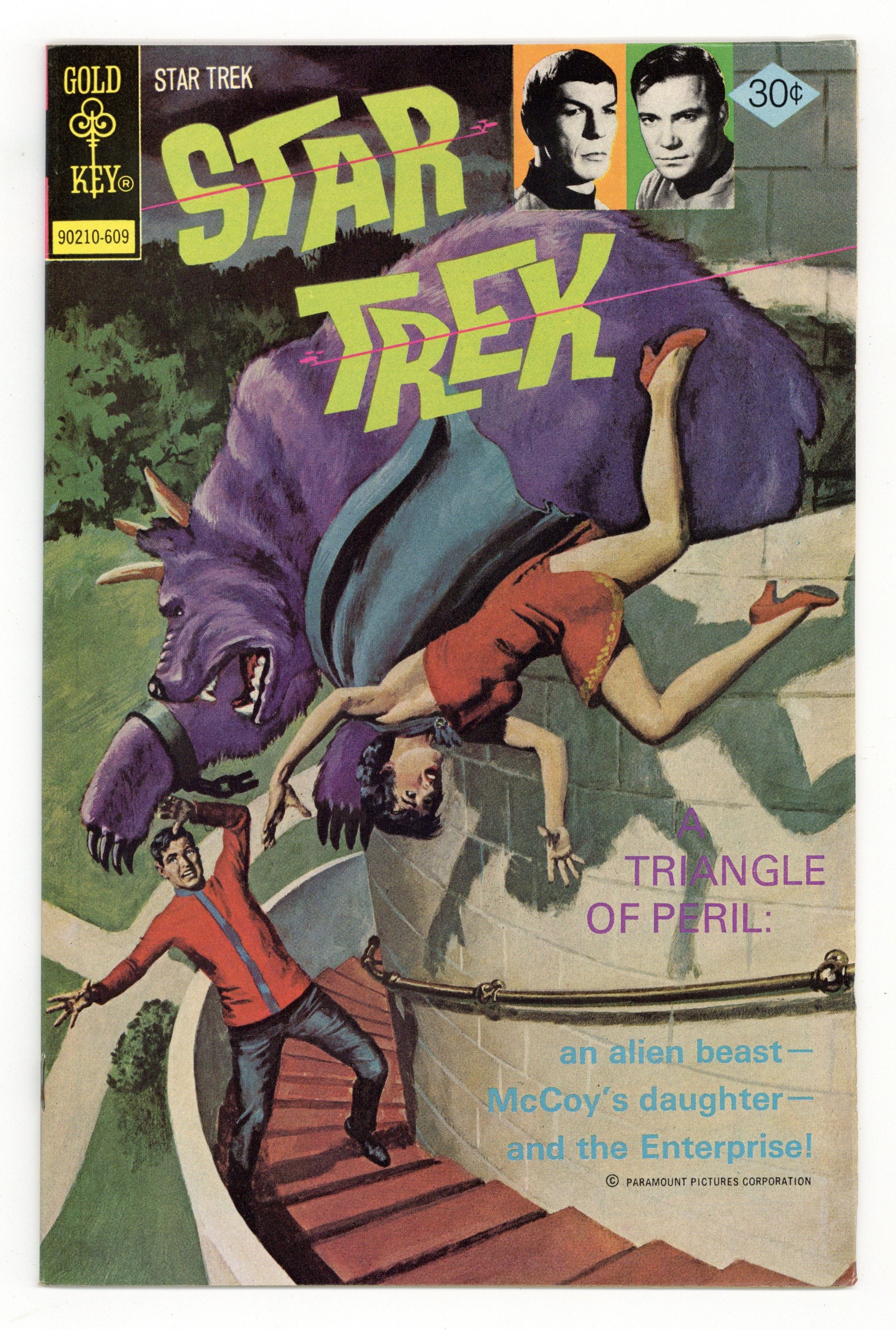 Number/month on cover: none listed. Comic book version of the original Star Trek TV series that starred William Shatner and Leonard Nimoy. This issue features "Furlough to Fury - Part 1" and "Part 2 - The Great Eye of Ara" in which the Enterprise's furlough on Earth leads to adventures with Dr. McCoy's daughter. Story credits unknown. Art by Alden McWilliams. Cover price $0.30.
