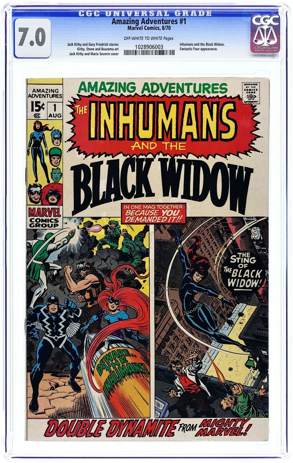 Cover pencils by Jack Kirby (Inhumans) and John Romita (Black Widow), inks by John Romita. "Beware... the Inhumans!", script by Jack Kirby, pencils by Jack Kirby, inks by Chic Stone; Two missiles are shot at the Inhumans; The second one is destroyed just before it hits and the wreckage points to the Fantastic Four as the ones firing it. "Then Came... the Black Widow," script by Gary Friedrich, pencils by John Buscema, inks by John Verpoorten; Black Widow, bored by her civilian life, gets a new costume. 36 pgs, full color. $0.15. Cover price $0.15.