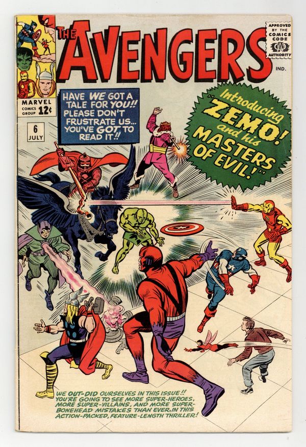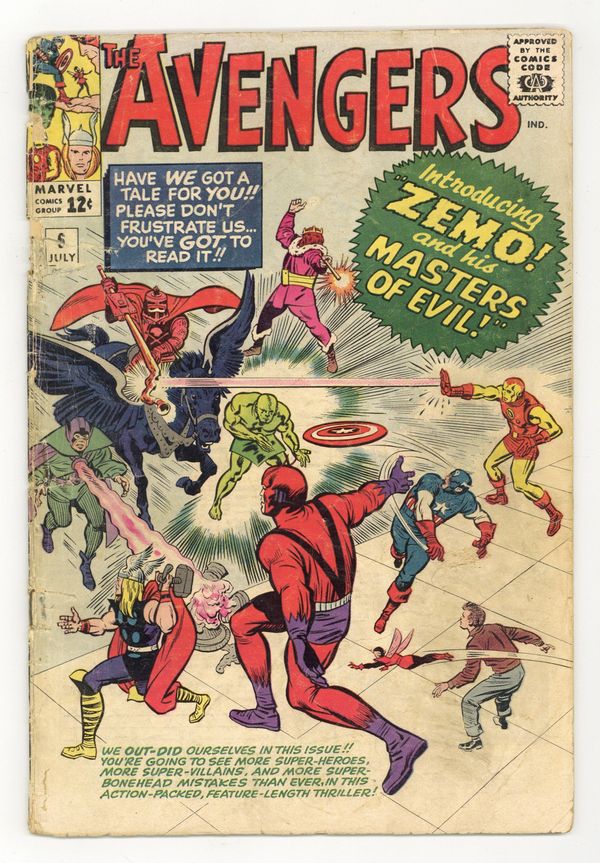 Cover pencils by Jack Kirby, inks by Chic Stone. First full appearance of Baron Zemo, and first appearance of the second Black Knight in "Masters of Evil!", script by Stan Lee, pencils by Jack Kirby, inks by Chic Stone; Baron Zemo, the man behind the cause of Bucky's death discovers that Captain America is still alive; Collecting together the Black Knight, Radioactive Man and the Melter, the Masters of Evil are formed; While the Masters of Evil spray the city with 'Adhesive X', a powerful glue for which there is no solvent, the Avengers attack; Captain America and Giant-Man get trapped by the adhesive and the Avengers withdraw to try and find a solution for it; Wasp remembers that a criminal behind bars called Paste-Pot Pete might be able to help; After receiving the solution they free Captain America and Giant-Man, and attack the Masters again. Special bonus: The letter column in this issue leads off with a letter from Buddy Saunders, the owner of MyComicShop. Oh, for the halcyon days of our callow youth! In the letter Buddy tells Stan and Jack that Avengers #4, with the return of Captain America, was one heck of a great issue. Time has certainly proven him right! 36 pgs., full color. $0.12. Cover price $0.12.