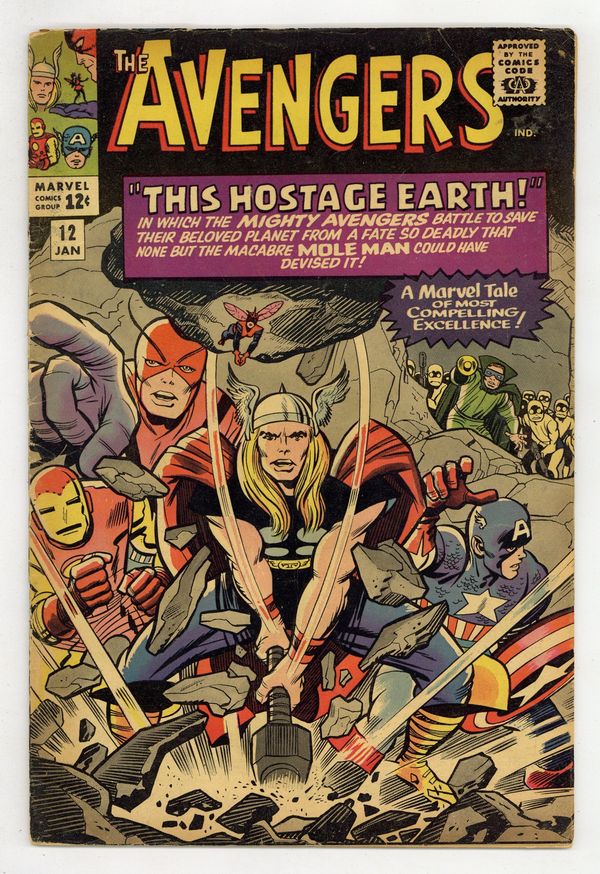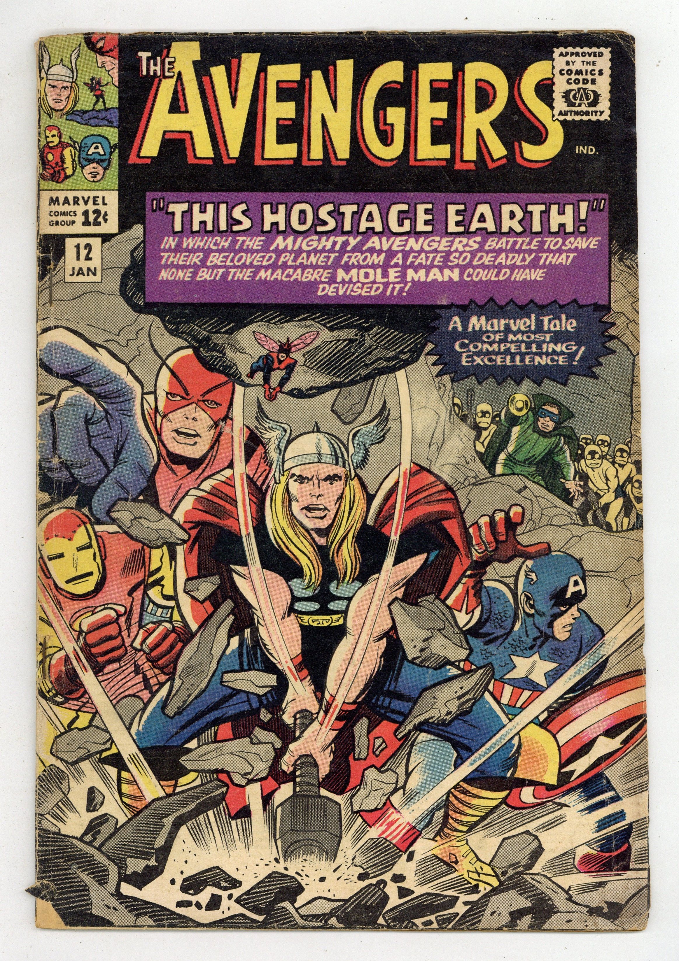Starts Jan 3 Cover pencils by Jack Kirby, inks by Chic Stone. "This Hostage Earth!", script by Stan Lee, pencils by Don Heck, inks by Dick Ayers; Ants warn Giant Man that there is something wrong, but none of the other Avengers believe him; In truth, it is the Mole Man, who plans to destroy the surface world by making the Earth spin very fast on its axis; And now, with his new ally the Red Ghost, how can he be stopped? Avengers Roll Call: Captain America, Thor, Iron Man, Giant Man, Wasp, and Rick Jones. Villains: the Red Ghost, the Mole Man, and the first appearance of Monk Keefer. Flashback cameos by Mr. Fantastic, Invisible Girl, and Human Torch (of the Fantastic Four). Letters to the editor from science fiction writer George R.R. Martin and Steve Erickson (the writer?). Reprinted in Marvel Triple Action # 6. 36 pgs., full color. $0.12. Cover price $0.12.