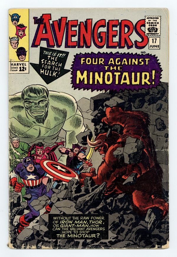 "Four Against the Minotaur!" Script by Stan Lee, pencils by Don Heck (some faces retouched by Jack Kirby), inks by Dick Ayers. Avengers Roll Call: Captain America, Hawkeye, Quicksilver, Scarlet Witch, and Rick Jones. Villains: the Mole Man, the Leader, and the first and only appearance of a minotaur. Guest appearance by the Hulk. As this and the story from Tales to Astonish 69 take place at the same time, some panels are reproductions of the Astonish panels. Reprinted in Marvel Triple Action # 11. Kirby/Frank Giacoia cover. 36 pgs. Cover price $0.12.