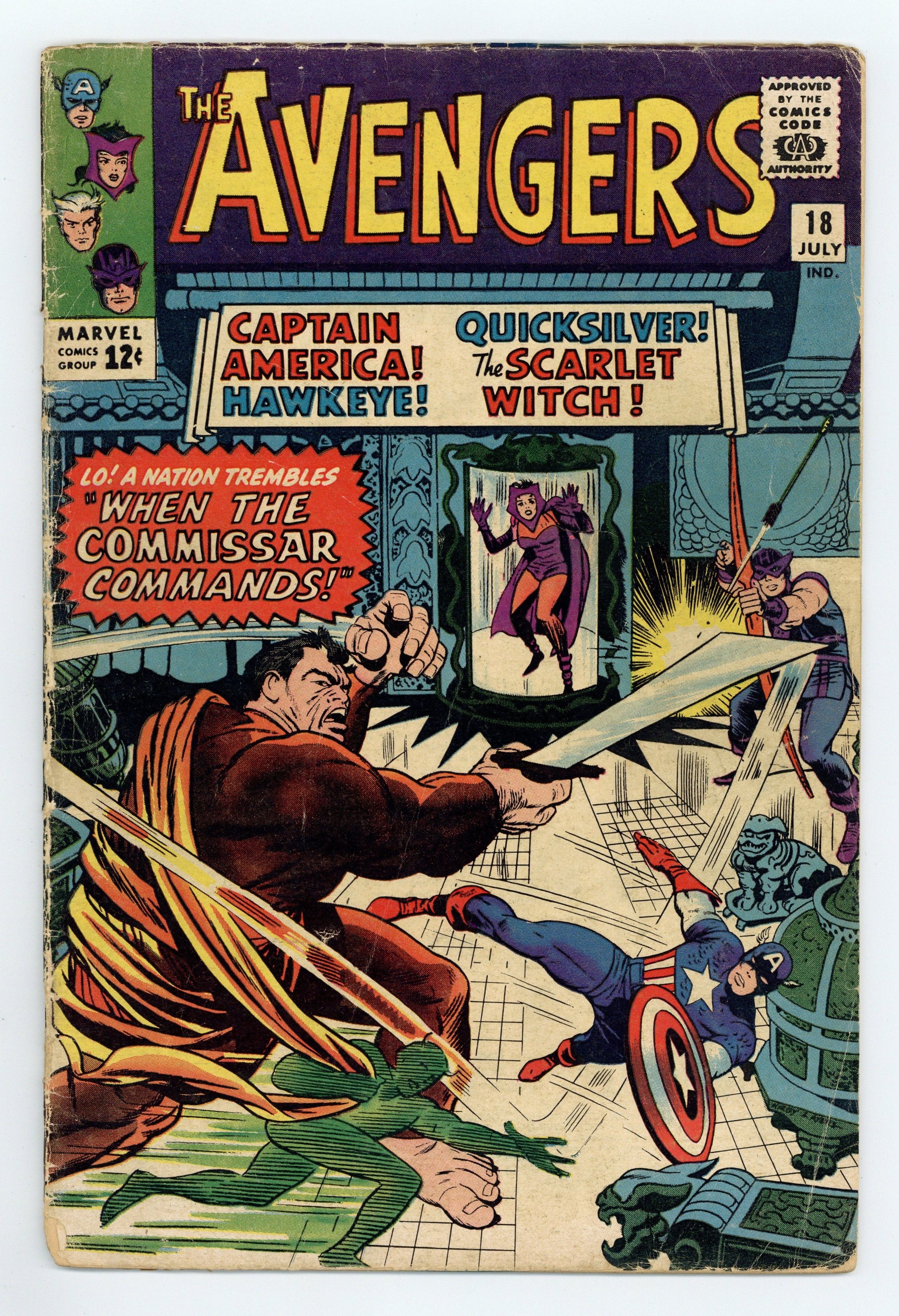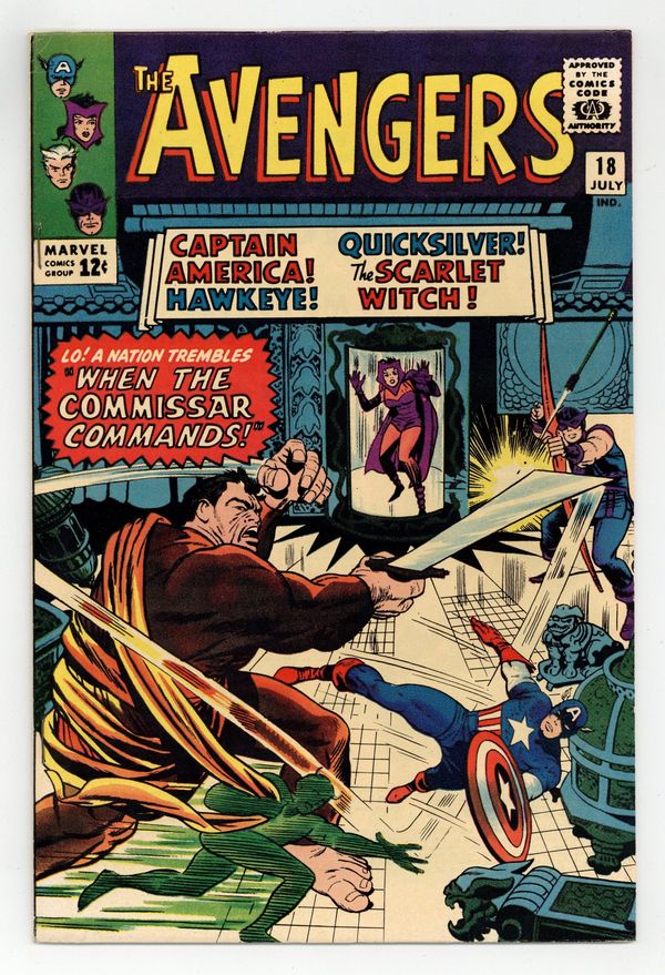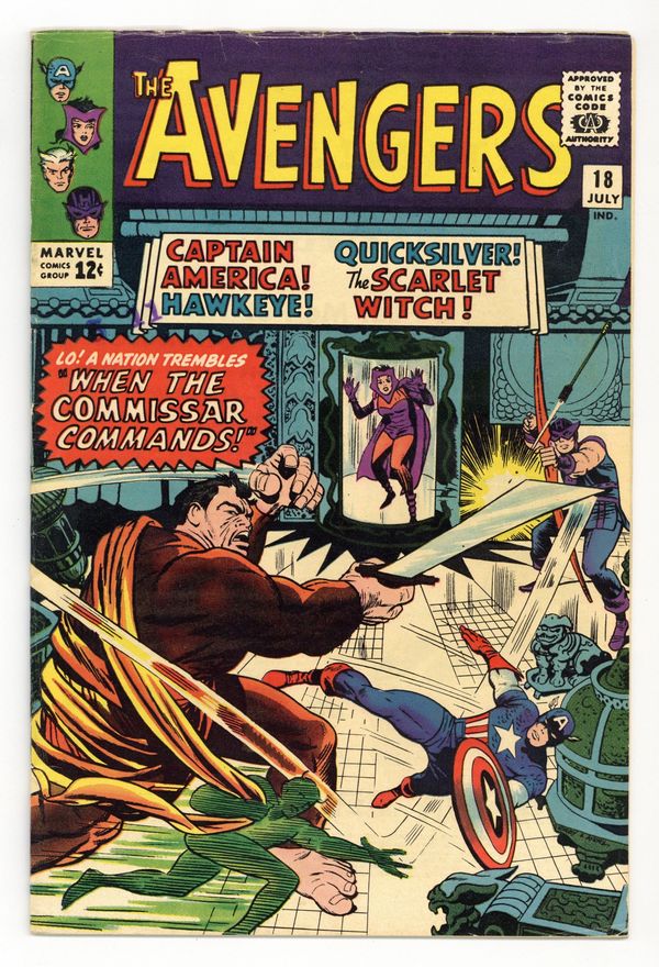 Cover pencils by Jack Kirby, inks by Dick Ayers. "When the Commissar Commands!", script by Stan Lee, pencils by Don Heck, inks by Dick Ayers; The Reds (evil commies) led by the monstrous Commissar are enslaving the peaceful land of Sin-Cong; The Avengers travel to that land to aid the people. Commissar defeats them all except the Scarlet Witch who discovers and destroys the Commissar's control panel, ending him. Avengers Roll Call: Captain America, Hawkeye, Quicksilver, and the Scarlet Witch. Appearance by Edwin Jarvis. Villains: Major Hoy and the Communists oppressors of Sin Cong (first and only appearance). Cameo by Nick Fury. Letter to the editor from Ted White (the writer?). Reprinted in Marvel Triple Action # 12. 36 pgs., full color. $0.12. Cover price $0.12.