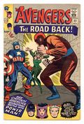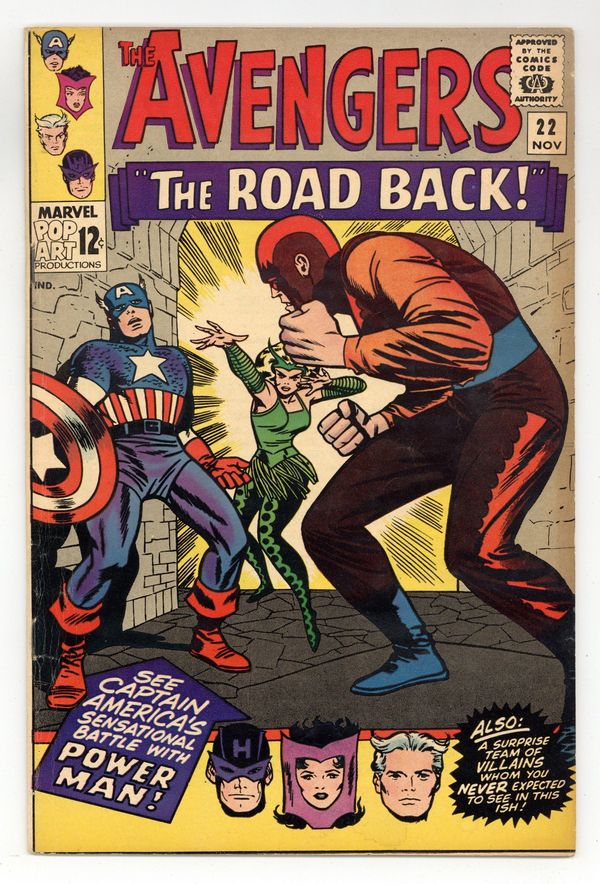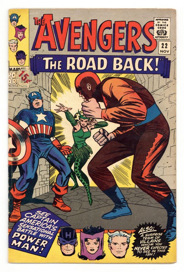 Cover pencils by Jack Kirby, inks by Wally Wood (vignettes by Don Heck and Dick Ayers/Frank Giacoia). "The Road Back," script by Stan Lee, pencils by Don Heck, inks by Wally Wood; Forced to disband the Avengers, Hawkeye, Quicksilver, and Scarlet Witch cannot find work until the Ringmaster hires them; Unable to control them, he tells the police that they tried to rob his Circus; Suddenly the three are on the run; Working on his own, Cap is able to pin the whole scheme on Enchantress and Power Man; Enchantress bails back to Asgard; Power Man, deprived of his lady love, surrenders; The City Council withdraws its order: the Avengers may assemble again. Avengers Roll Call: Captain America (leaves Avengers at end of story), Hawkeye, Quicksilver, and Scarlet Witch. Villains: the first Power Man (Erik Josten), the Enchantress, the Ringmaster, Princess Python, the Clown, Cannonball, Luigi Gambonno, Ernesto Gambonno, and Bruto the Strongman. Cameos by the Mad Thinker's "awesome" Android, Iron Man, Thor, and Giant Man. Reprinted in Marvel Triple Action #16. 36 pgs., full color. $0.12. Cover price $0.12.