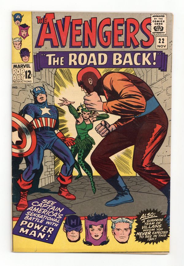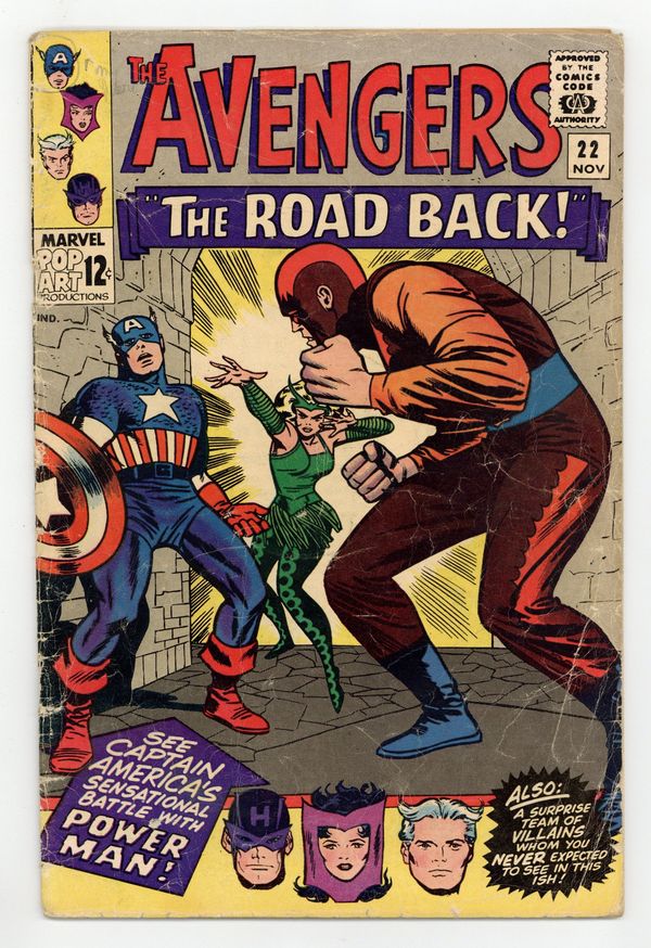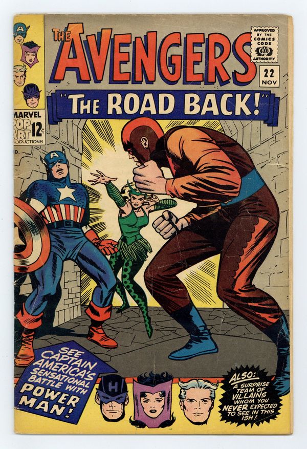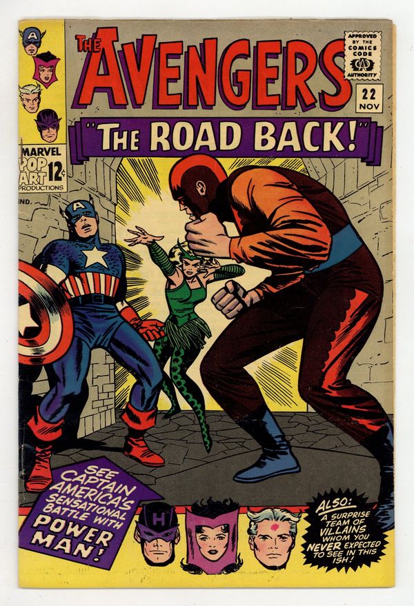 Tags: Marvel Legacy Numbering: Avengers (part 22), Avengers$16.75Cover pencils by Jack Kirby, inks by Wally Wood (vignettes by Don Heck and Dick Ayers/Frank Giacoia). "The Road Back," script by Stan Lee, pencils by Don Heck, inks by Wally Wood; Forced to disband the Avengers, Hawkeye, Quicksilver, and Scarlet Witch cannot find work until the Ringmaster hires them; Unable to control them, he tells the police that they tried to rob his Circus; Suddenly the three are on the run; Working on his own, Cap is able to pin the whole scheme on Enchantress and Power Man; Enchantress bails back to Asgard; Power Man, deprived of his lady love, surrenders; The City Council withdraws its order: the Avengers may assemble again. Avengers Roll Call: Captain America (leaves Avengers at end of story), Hawkeye, Quicksilver, and Scarlet Witch. Villains: the first Power Man (Erik Josten), the Enchantress, the Ringmaster, Princess Python, the Clown, Cannonball, Luigi Gambonno, Ernesto Gambonno, and Bruto the Strongman. Cameos by the Mad Thinker's "awesome" Android, Iron Man, Thor, and Giant Man. Reprinted in Marvel Triple Action #16. 36 pgs., full color. $0.12. Cover price $0.12.