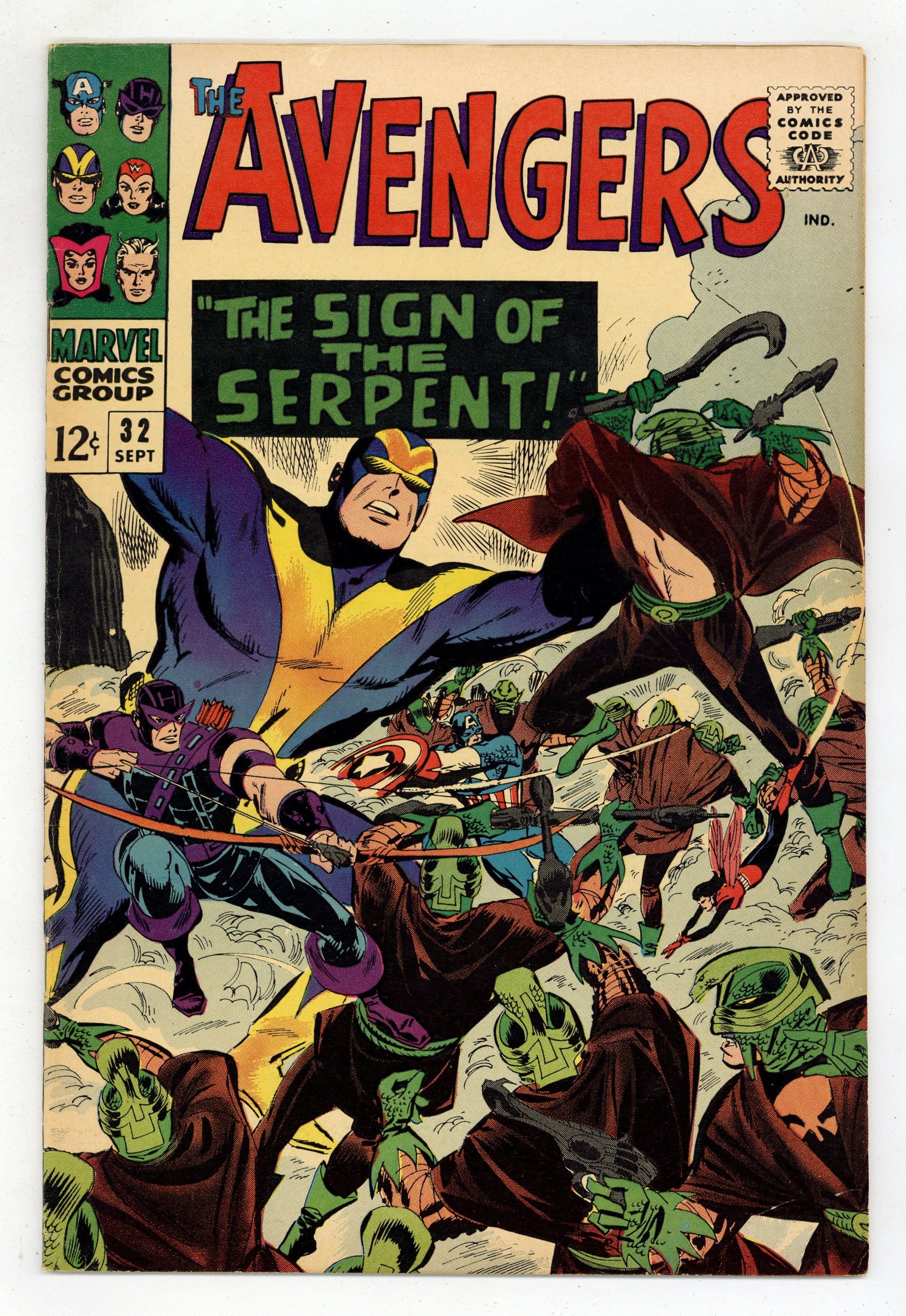 Starts Apr 4 Cover by Don Heck. "The Sign of the Serpent!", script by Stan Lee, pencils by Don Heck; Captain America encourages Goliath to keep looking for a solution to his height-switching ability and finds a new assistant, Bill Foster; The Sons of the Serpent attack foreign people, including General Chen, the dictator of a communist country while he visits the UN; The Black Widow provides information to Hawkeye to prove herself to him. Quicksilver and the Scarlet Witch discover they will regain their full powers; Bill Foster, being African-American, gets attacked by the Sons of the Serpent; Captain America goes to Nick Fury for more information about them; The Avengers vow to defeat the Sons of the Serpent, but Captain America is kidnapped. Avengers roll call: Captain America, Hawkeye, Goliath, the Wasp, and, briefly, Quicksilver and the Scarlet Witch. Tony Stark (Iron Man) and Nick Fury guest appearances. Reprinted in Giant-Size Marvel Triple Action #2. 36 pgs., full color. $0.12. Cover price $0.12.
