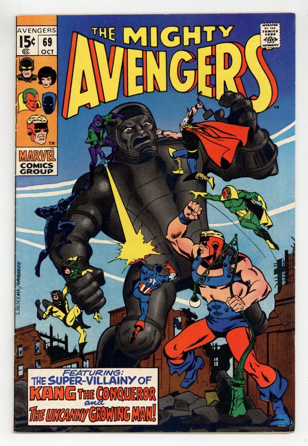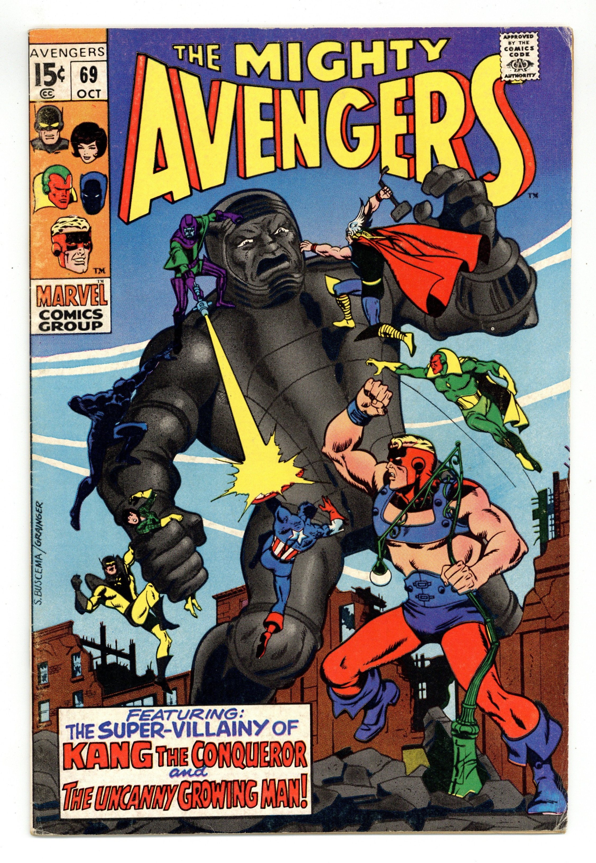 "Let the Game Begin!" Part 1 of 3. Script by Roy Thomas. Pencils by Sal Buscema. Inks by Sam Grainger. Cover by Sal Buscema and Sam Grainger. Fate of Tony Stark: Part 3 of 4 - After the events of Iron Man 18, Earth's Mightiest Heroes rush to the hospital to check on the condition of their benefactor, Tony Stark! While waiting in Tony's room, the Wasp notices a small doll lying on the floor. But it's not a small doll; it's a small man…the Growing Man! And in a matter of minutes the alien stimuloid surges to thirty-feet tall and grabs Tony! The Avengers begin pursuing the Growing Man but are suddenly halted and whisked away to another place and time! Wow, who could have done that? Who else…but the Master of Time! Kang the Conqueror has transported the Avengers to the 41st century to fight as his pawns in the game of the galaxies! And the game starts next issue vs. the Squadron Sinister! First appearances of the Grandmaster, Kyle Richmond (cameo), and the Squadron Sinister (cameo). Additional cameo appearances by Ravonna, Doctor Spectrum, Hyperion, Nighthawk (aka Kyle Richmond), and the Whizzer. Avengers Lineup: Black Panther, Captain America, Goliath, Hawkeye, Iron Man, Thor, Vision, Yellowjacket, and the Wasp. (Notes: This is the first appearance of Kyle Richmond who would eventually become a long-time member of the Defenders. The Whizzer is a new villain not to be confused with the golden age Whizzer (aka Bob Frank). Kang and the Growing Man previously appeared in Thor 140. The Avengers last fought Kang in Avengers 23 & 24.) 36 pages. Cover price $0.15.