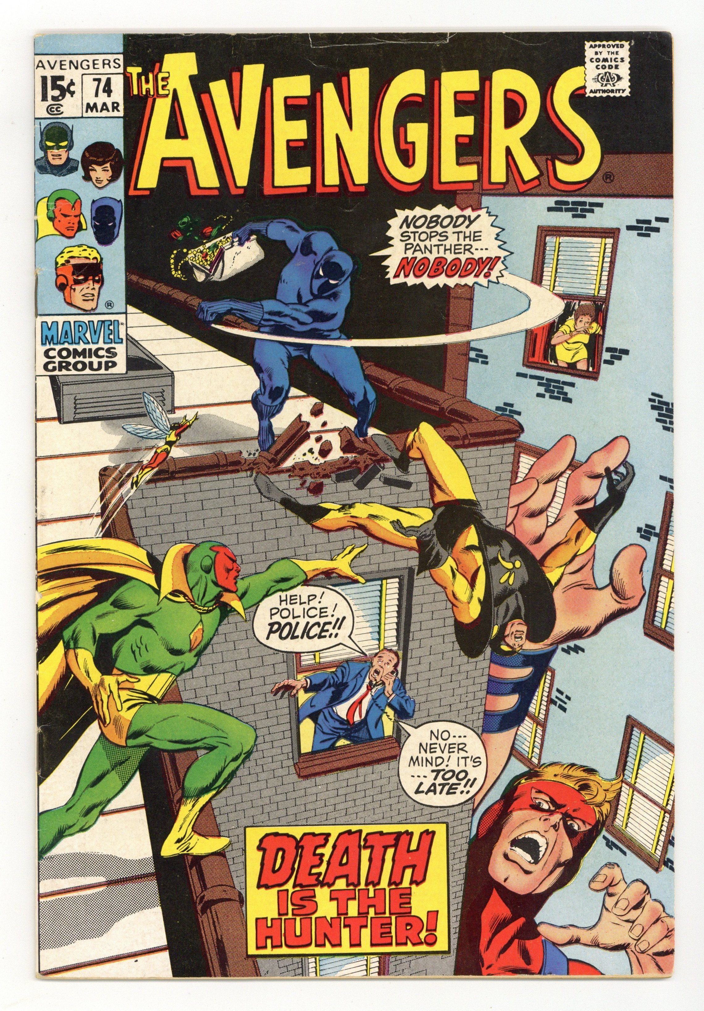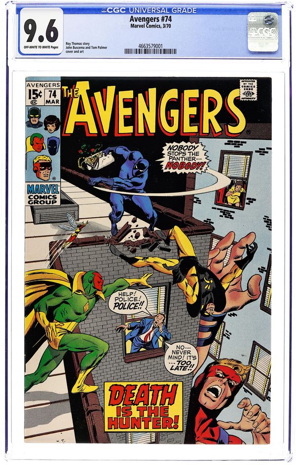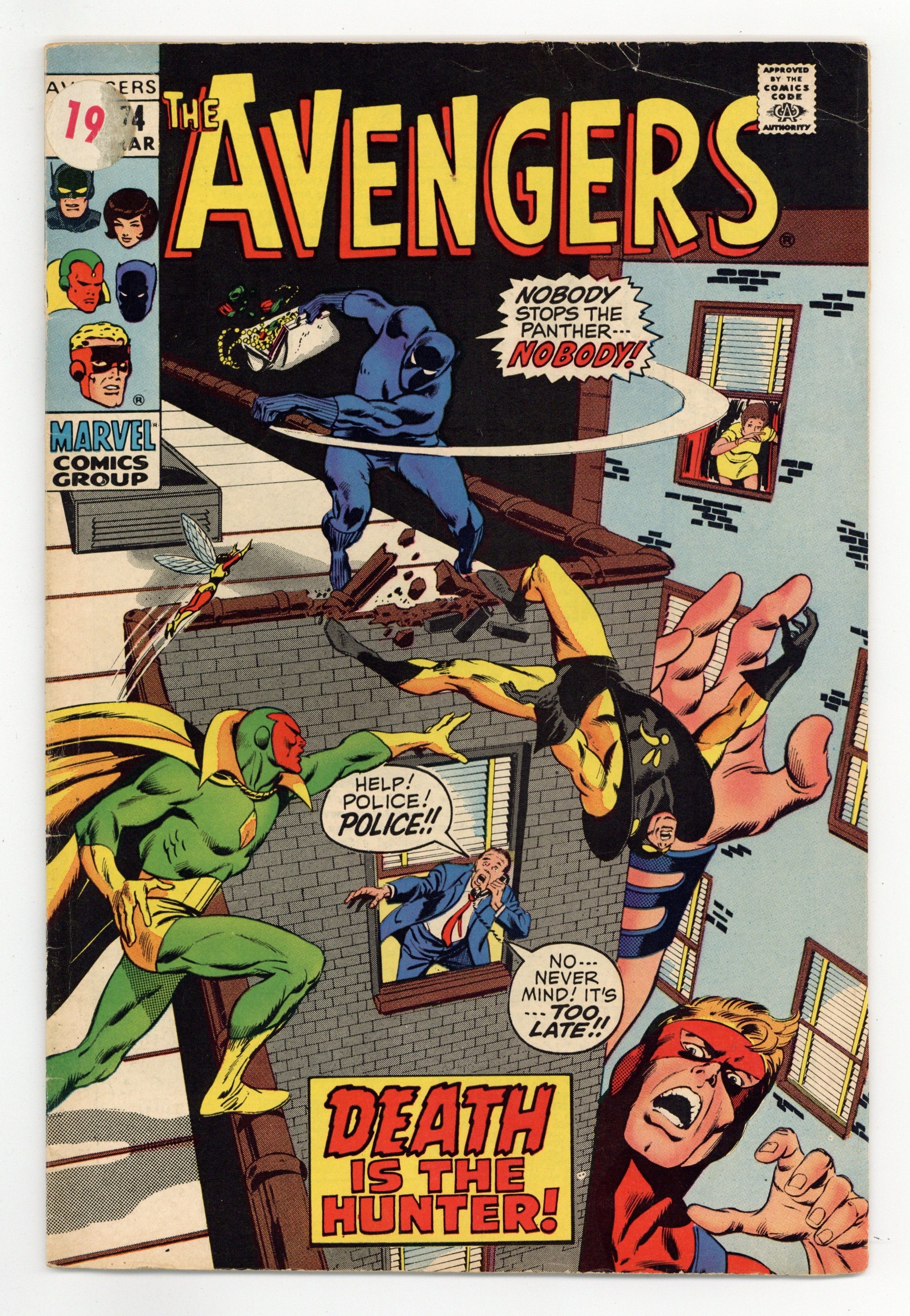 "Pursue the Panther!" Part 2 of 2. Script by Roy Thomas. Pencils by John Buscema. Inks by Tom Palmer. Cover by John Buscema and Tom Palmer. With T'Challa as their prisoner, the Sons of the Serpent launch an all-out media blitz to divide America along racial lines! And the highlight of the serpents' sinister plan is to unmask the Black Panther on national TV! However, the Avengers are frantically searching the city and finally discover their missing teammate's location! With the bright lights shining and the TV cameras rolling, can Earth's Mightiest Heroes squash the serpents and restore harmony in the United States? In the Avengers we trust! (Notes: This issue is Tom Palmer's first work on the Avengers series; and also the first of many Buscema (pencils) and Palmer (inks) pairings on the title. The letters page includes a statement of ownership: average print run 411,541; average paid circulation 239,986.) 36 pages. Cover price $0.15.