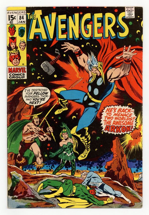 "The Sword and the Sorceress!" Script by Roy Thomas. Pencils by John Buscema. Inks by Tom Palmer. Cover by John Buscema and Sal Buscema. The beleaguered Black Knight journeys to the world of Polemachus to solve the mystery of his bloodthirsty ebony blade! However, Dane Whitman doesn't know who rules this extra-dimensional planet! Arkon the Magnificent! And the Imperion has a new ally on his home world: the Enchantress! That can't be good for Earth's Mightiest Heroes! And it's not once Arkon captures the knight, and the enchanting Asgardian teleports Wanda, Pietro, Goliath, and the Vision to Polemachus! But back on Earth, the Black Panther enlists the aid of the thunder god; and shortly thereafter all parties are on Polemachus and ready to rumble! The Avengers vs. Arkon and the Enchantress! A marvelous matchup indeed! Flashback cameo by the sixth century Black Knight (aka Sir Percy of Scandia). Avengers Lineup: Black Knight, Black Panther, Goliath, Quicksilver, Scarlet Witch, Thor, and the Vision. (Notes: Arkon returns in Fantastic Four 160. The letters page includes a letter from comics writer Mike Barr.) 36 pages. Cover price $0.15.