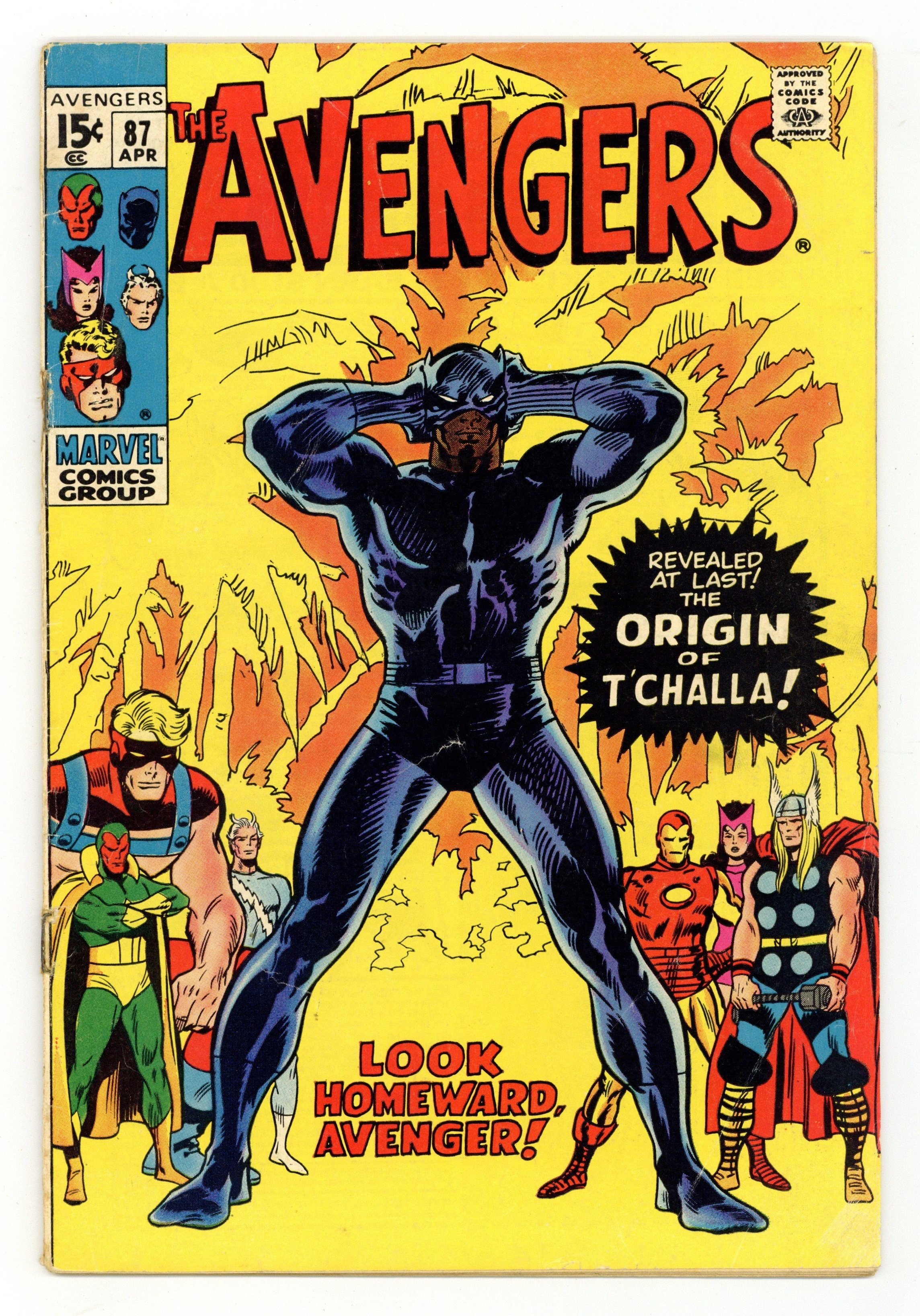 Tags: Marvel Legacy Numbering: Avengers (part 87), Avengers$50.00"Look Homeward, Avenger!" Origin of the Black Panther. Script by Roy Thomas. Pencils by Frank Giacoia. Inks by Sal Buscema. Cover by John Buscema and John Verpoorten. Feeling melancholy and homesick, T'Challa shares his personal story with Earth's Mightiest Heroes for the first time. The panther speaks about his childhood in Wakanda, the death of his father, his initial encounter with A.I.M., and the new leadership void in his homeland. The Black Panther has a big decision to make: stay with the Avengers or return to Wakanda. What will T'Challa do? Flashback cameos by Klaw, Advanced Idea Mechanics, and T'Chaka. Avengers Lineup: Black Panther, Goliath, Iron Man, Quicksilver, Scarlet Witch, Thor, and the Vision. (Note: The Black Panther appears next in Astonishing Tales 6 & 7 for a clash with Doctor Doom.) 36 pages. Cover price $0.15.