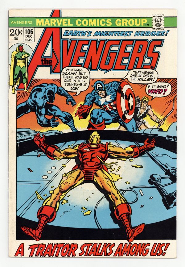 "A Traitor Stalks Among Us!" Part 1 of 3. Script by Steve Englehart. Pencils by Rich Buckler and George Tuska. Inks by Dave Cockrum. Cover by Rich Buckler and Frank Giacoia. Wanda has found another lead in the search for her missing brother. In hopes of finding Pietro, four avengers explore an underground tunnel in Manhattan! But something strange is going on beneath the streets...and the Black Panther, Scarlet Witch, Iron Man, and Hawkeye suddenly begin fighting one another! Could an old foe from long ago be manipulating the Avengers? Or maybe a super-villain of more recent vintage? Perhaps the answer is both! Meanwhile at Avengers Mansion, the Vision continues to ponder the Grim Reaper's offer to inhabit Simon Williams' comatose body. Captain America attempts to counsel the synthezoid avenger, but is interrupted by Rick Jones' barging into the mansion! Upon seeing Rick, the shield-slinger suffers a flashback to a battle vs. Hydra several months ago (in Captain America 113)! Very strange indeed! Cameo appearances by Captain Marvel and the Grim Reaper. (Note: The Space Phantom previously appeared way back in Avengers (1st series) 2.) 36 pages Cover price $0.20.