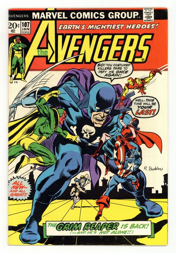 Tags: Marvel Legacy Numbering: Avengers (part 107), Avengers$19.50"The Master Plan of the Space Phantom!" Part 2 of 3. Script by Steve Englehart. Pencils by Jim Starlin (pages 1-3, 13-20) and George Tuska (pages 4-13) Inks by Dave Cockrum. Cover by Rich Buckler. The Space Phantom is back! And the Grim Reaper is right by his side! Four avengers have already fallen to the deadly duo and now only Captain America and the Vision remain free! The star-spangled avenger visits an old Hydra hideout to solve the mystery of his sudden flashbacks, while the synthezoid avenger wanders through Central Park. When the Grim Reaper catches up to the Vision, he makes him a final, yet different offer: Forget the body of Simon Williams, take the body of Captain America instead! Wow, would the Vision agree to that? Stay tuned! Flashback cameos by the original Avengers, Loki, Jane Foster, Rick Jones, and Madame Hydra to recap the events of Avengers (1st series) 2, Thor 108, and Captain America 113, respectively. Avengers Lineup: Black Panther, Captain America, Hawkeye, Iron Man, Scarlet Witch, and the Vision. (Note: The letters page includes a letter from Elfquest creator Wendy Pini.) 36 pages Cover price $0.20.