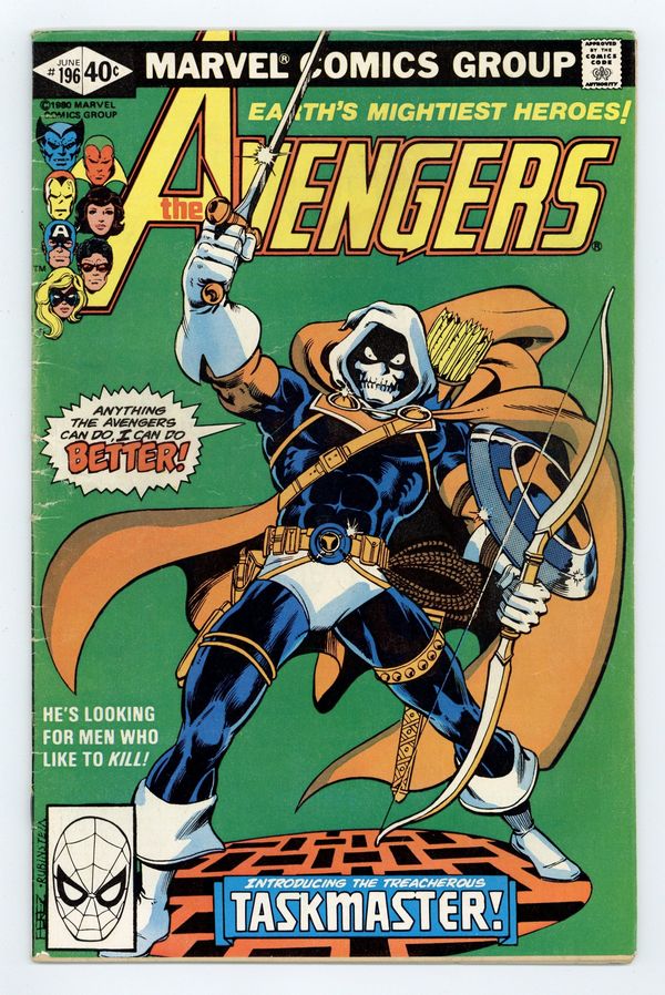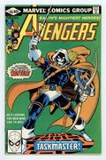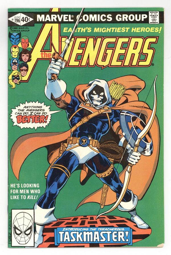 Direct Edition. "The Terrible Toll of the Taskmaster" Guest-starring Ant-Man. Script by David Michelinie. Pencils by George Perez. Inks by Jack Abel. Cover by George Perez and Joe Rubinstein. A brand new villain, the Taskmaster, has turned the tables on the Wasp, Yellowjacket, and Ant-Man! The three insect-like super-heroes are prisoners inside the Taskmaster's training academy! The good news is that seven avengers are waiting outside the training compound, but the bad news...none of them know that their teammates are in grave danger! However, Earth Mightiest Heroes follow the ants, and the trail leads to the Taskmaster! Is the villain with the photographic reflexes ready to battle the Avengers? Choose wisely dear Taskmaster! First (full) appearance and origin of the Taskmaster. (Notes: The Taskmaster appears next in Marvel Team-Up 103. The letters page includes a letter from comics writer Kurt Busiek.) 36 pages Cover price $0.40.