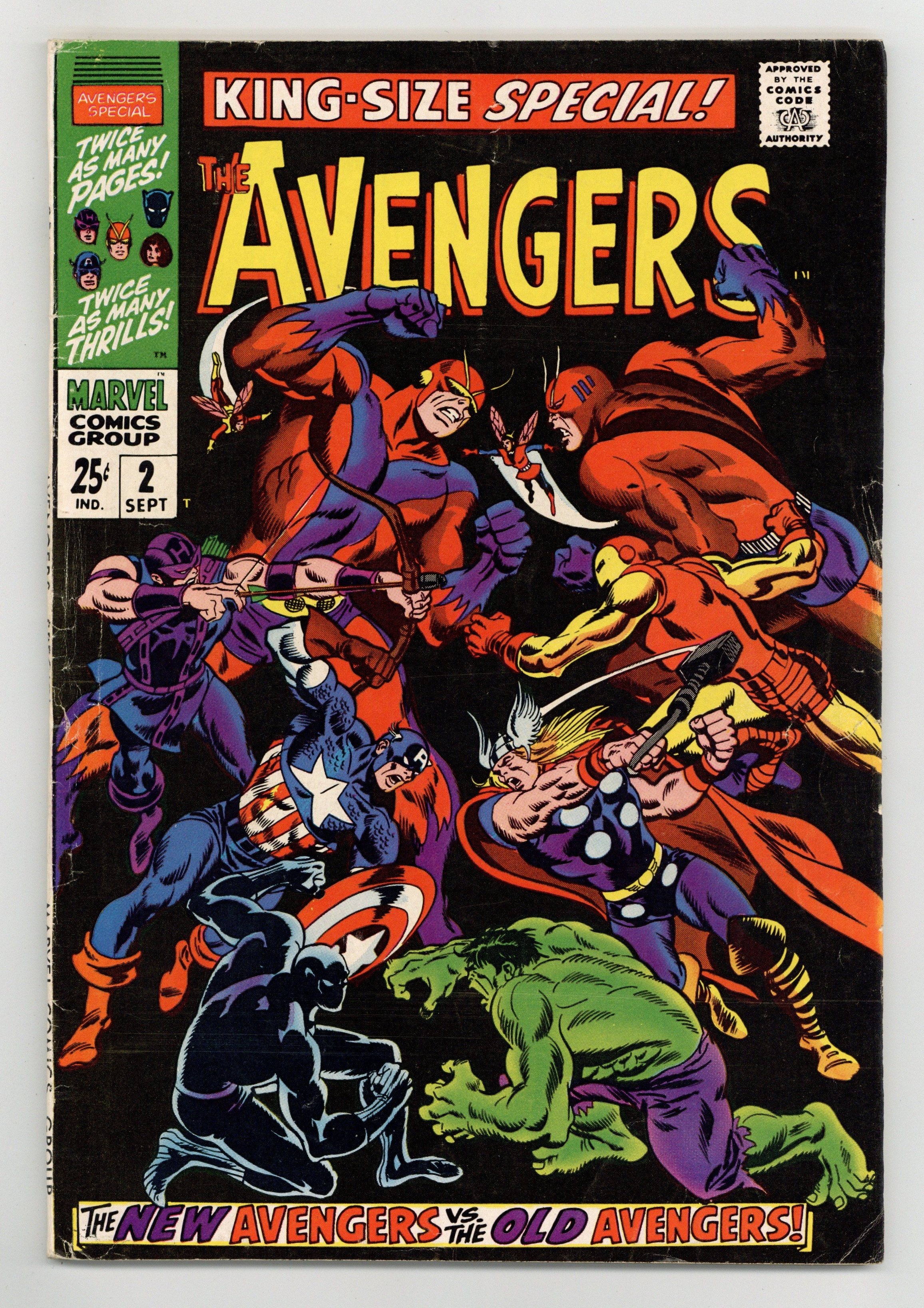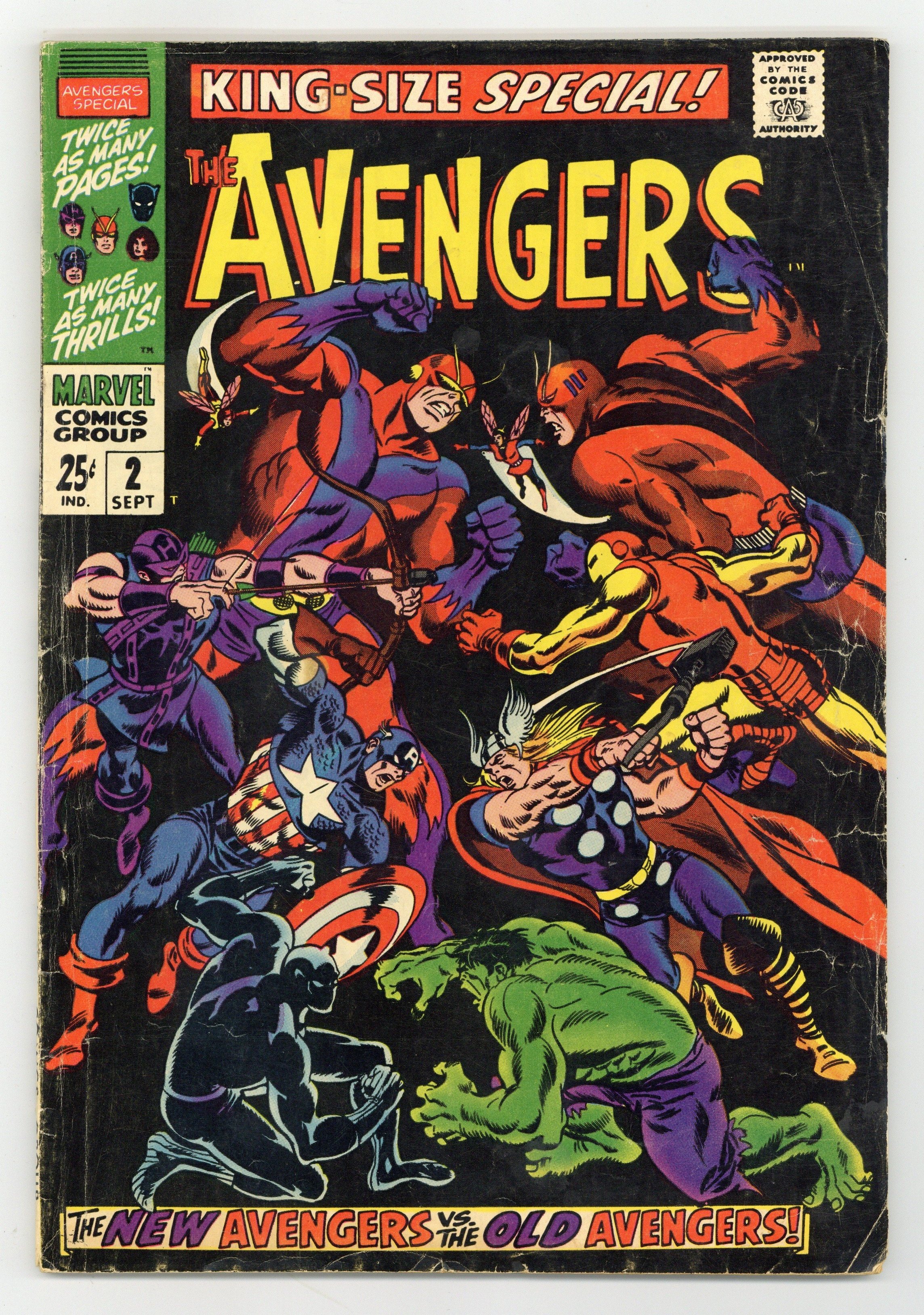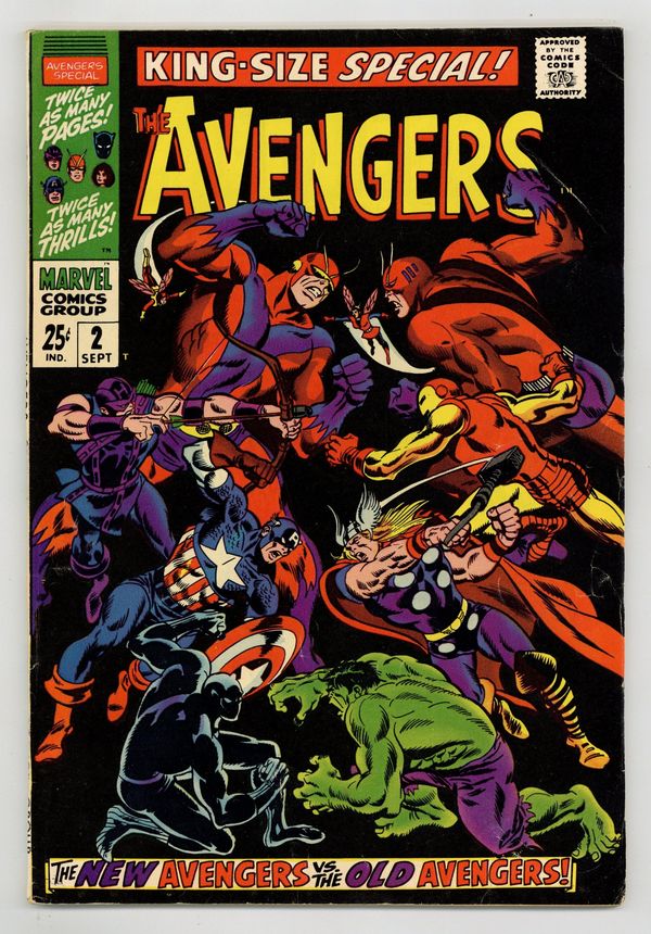 $50.00"...And Time, the Rushing River..." First appearance of the Scarlet Centurion. Script by Roy Thomas. Art by Don Heck (layouts) and Werner Roth (finishes). Inks by Vince Colletta. Cover by John Buscema and Frank Giacoia. Earth's Mightiest Heroes return to their mansion following the events of Avengers (1st series) #56. But upon entering their home -- they discover the original avengers inside: Thor, Iron Man, Giant-Man, the Wasp, and the Hulk! What is happening? After a brief skirmish with the original team, Cap and his group flee the mansion to collect their thoughts...and realize they may have stumbled into an alternate reality! Oh boy, now what? The Avengers' only hope is to find Doctor Doom's time machine (on this world)...and go back in time to reverse history. However the mighty and mysterious Scarlet Centurion stands in their way! Can Earth's Mightiest outsmart the future Kang? And return to their rightful reality? Cameo appearance by the Watcher. Flashback cameos by the Fantastic Four, Daredevil, Dr. Strange, Spider-Man, Sub-Mariner, and the original X-Men. Second feature: "Hang Loose, Heroes!" Beautiful Two-page pin-up of all the avengers to date by John Buscema, George Klein, and Bill Everett. Third feature: "Avenjerks Assemble!" Script by Roy Thomas. Pencils by John Buscema. Inks by Frank Giacoia. Five-page parody of the Marvel bullpen. Avengers Lineup: Black Panther, Captain America, Goliath, Hawkeye, and the Wasp. (Note: What If (1st series) #29 revisits the alternate reality warped by the Scarlet Centurion.) 68 pages. Cover price $0.25.
