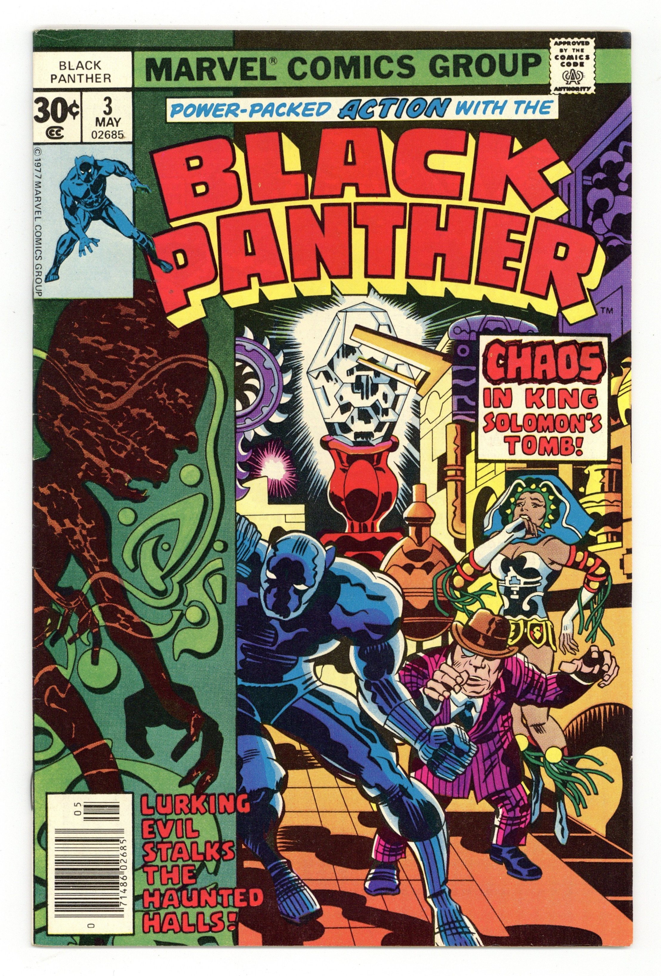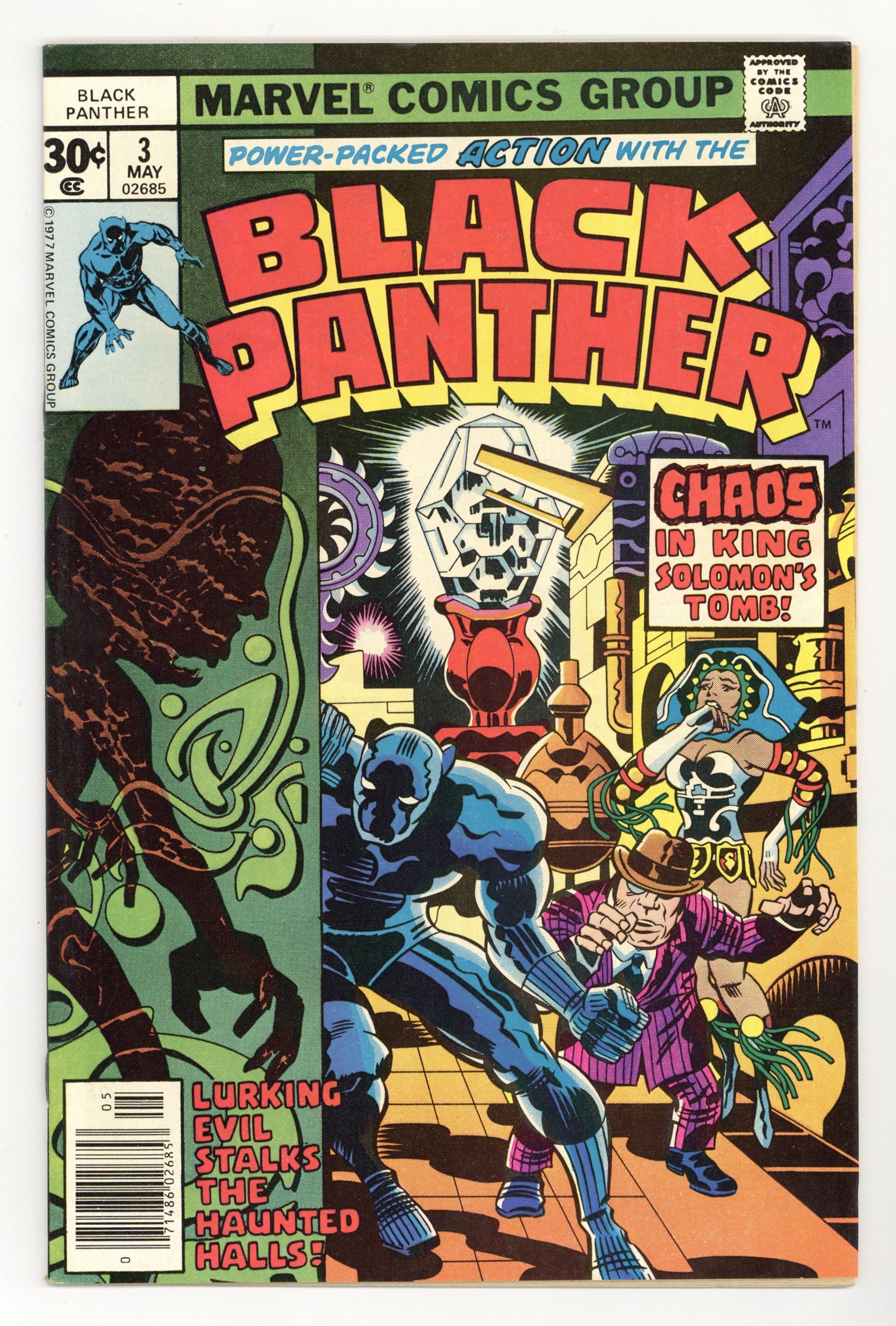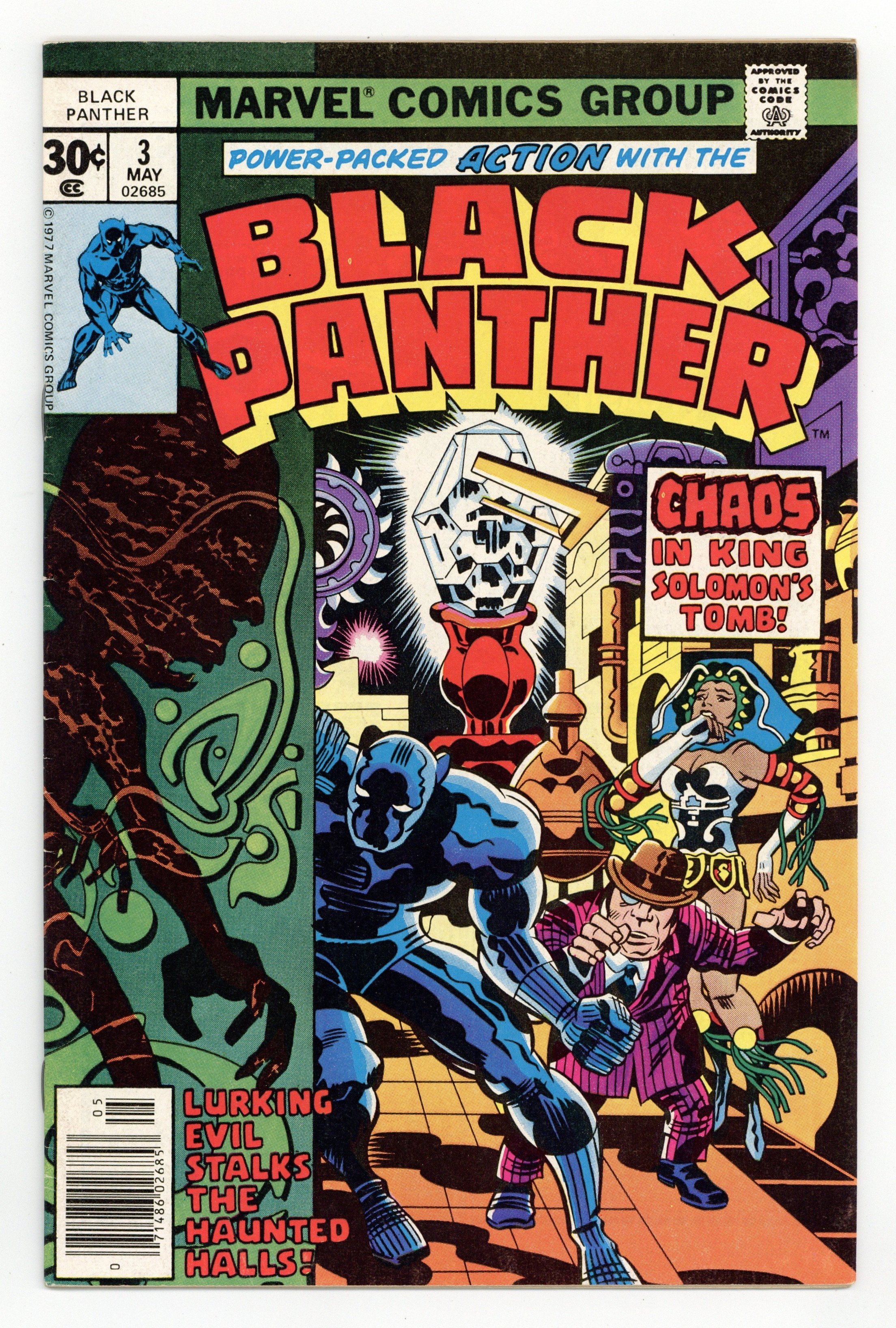 Cover pencils by Jack Kirby, inks by John Verpoorten. Race Against Time, script and pencils by Jack Kirby, inks by Mike Royer; Black Panther, Abner Little and Princess Zanda survive the perils of King Solomon's tomb to find the second Brass Frog; With the two Frogs connected, the ancient time machine is complete and the Panther is able to send Hatch-22 back to his own time in the future. 32 pgs. $0.30. Cover price $0.30.