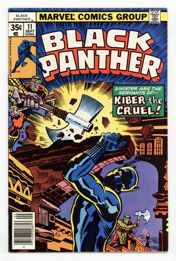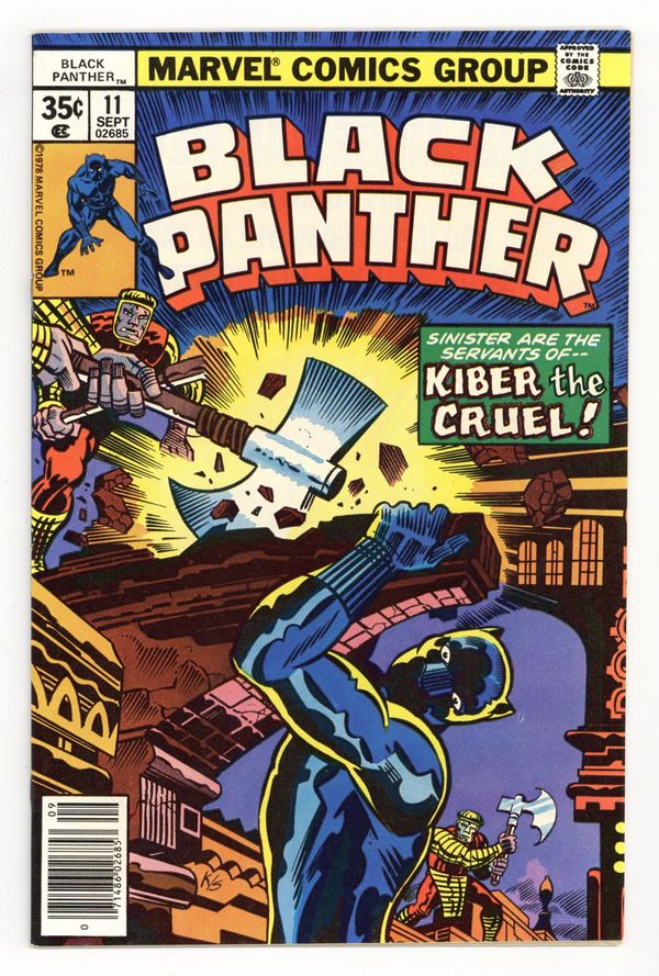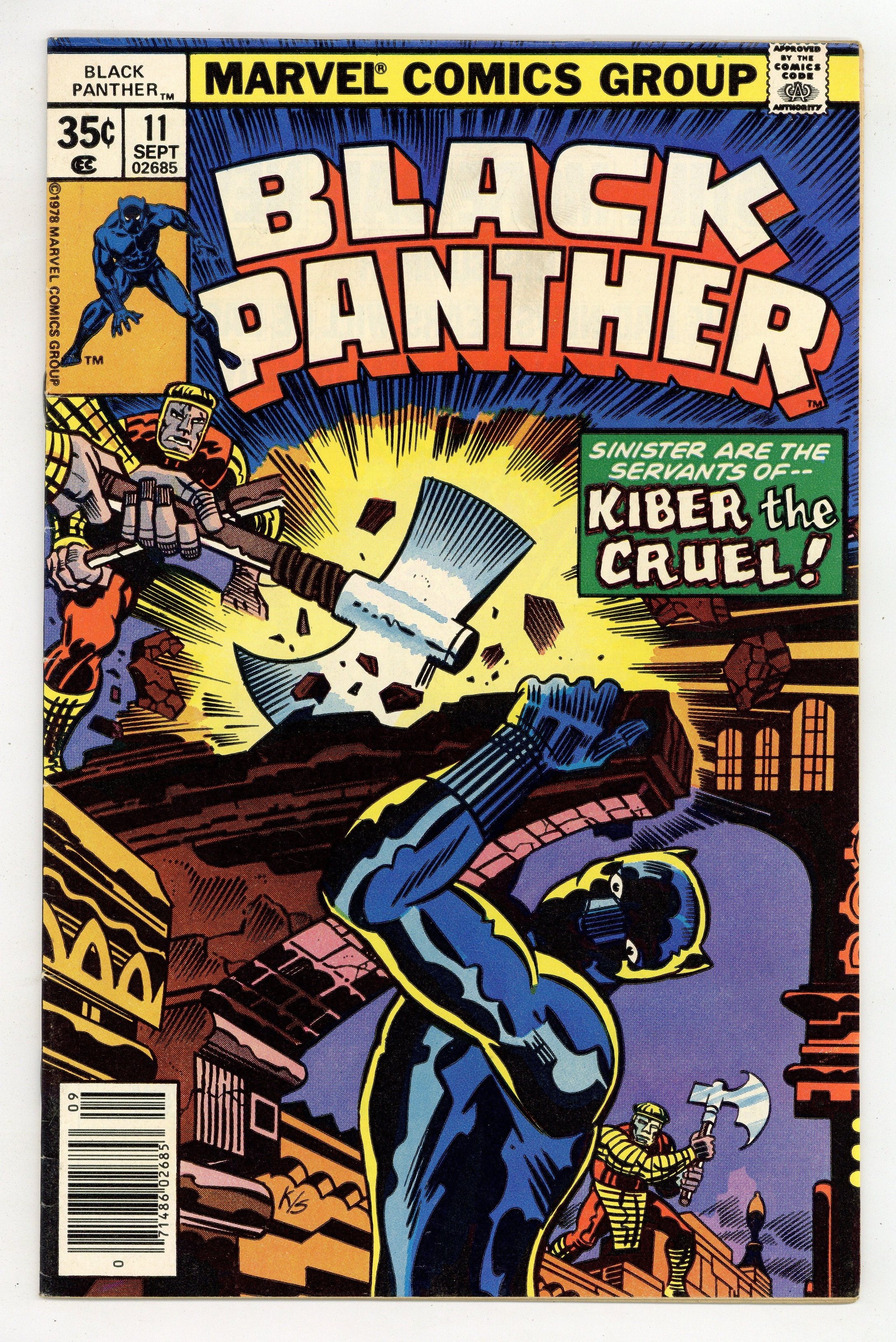 Tags: Marvel Legacy Numbering: Black Panther (part 11), Black Panther$20.00Cover pencils by Jack Kirby, inks by Joe Sinnott. Kiber the Cruel, script and pencils by Jack Kirby, inks by Mike Royer; Following his fight with Jakarra, T'Challa's exposure to the Vibranium has given him some powers of ESP. Khanata is kidnapped by Kiber who is turning humans into energy for life-giving power. 36 pgs. $0.35. Cover price $0.35.