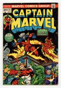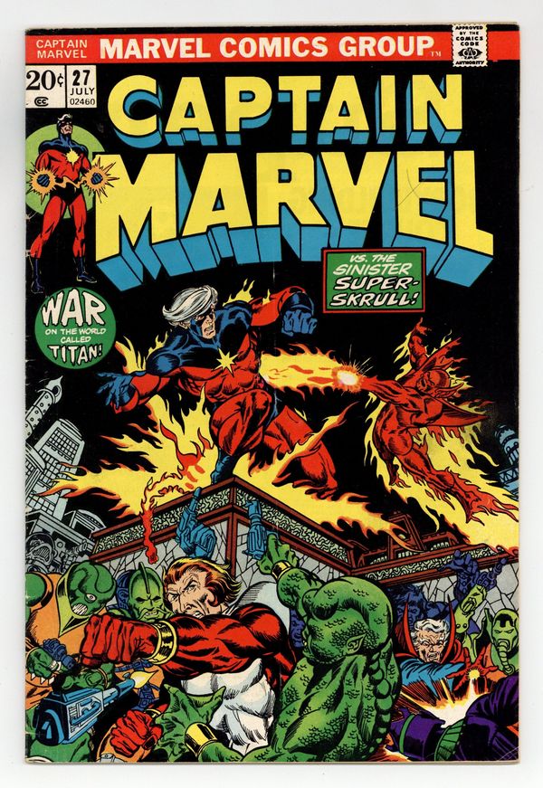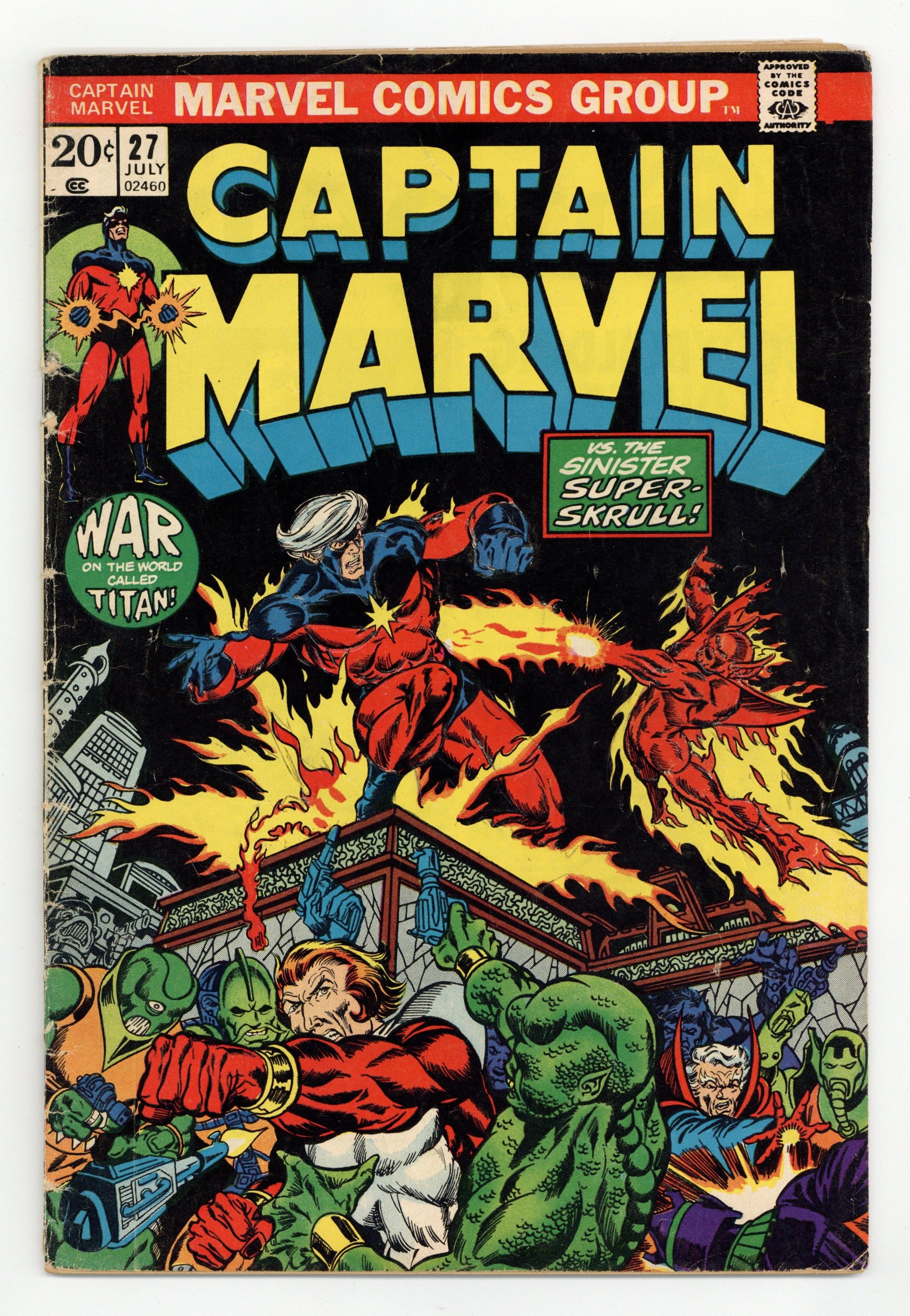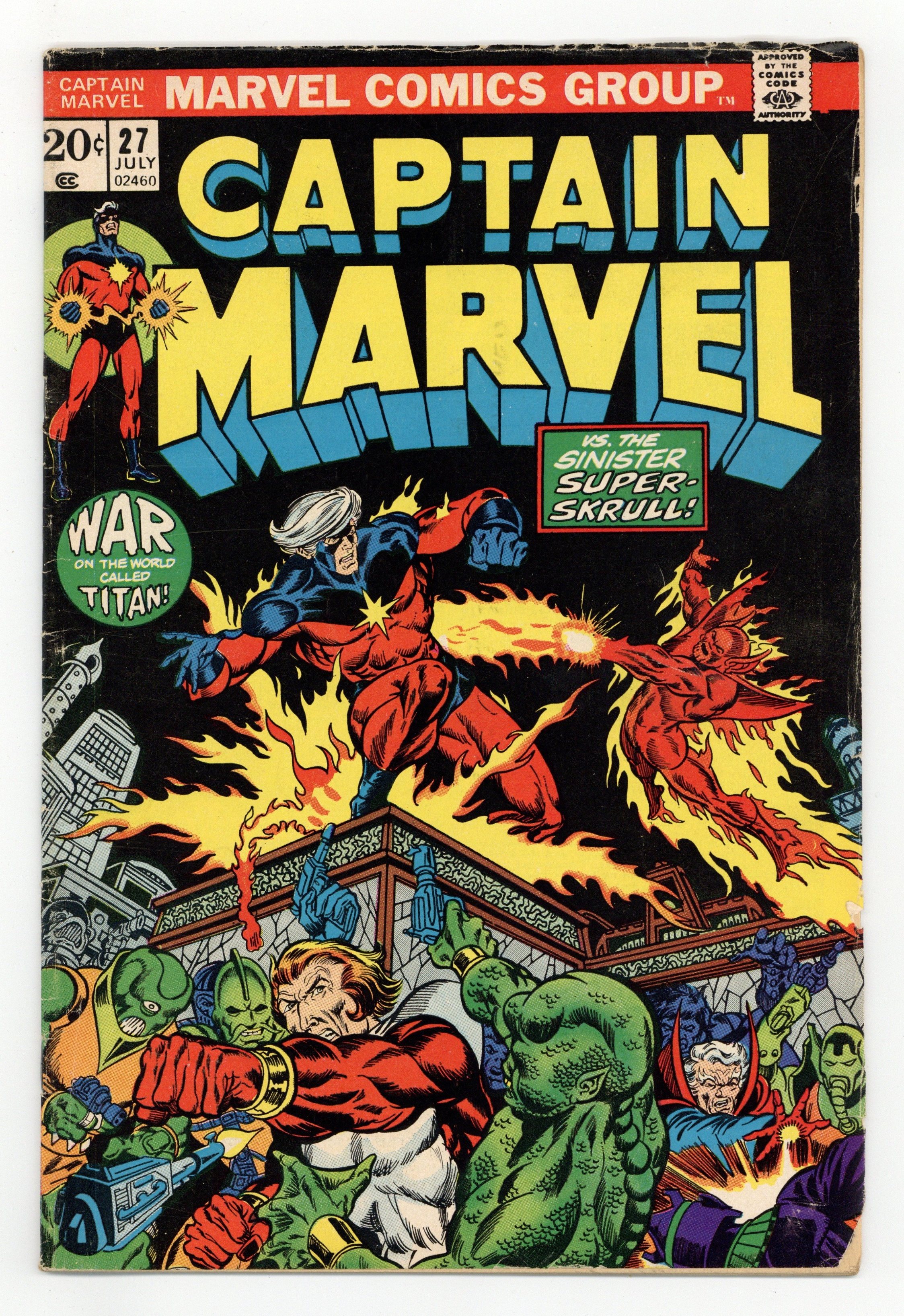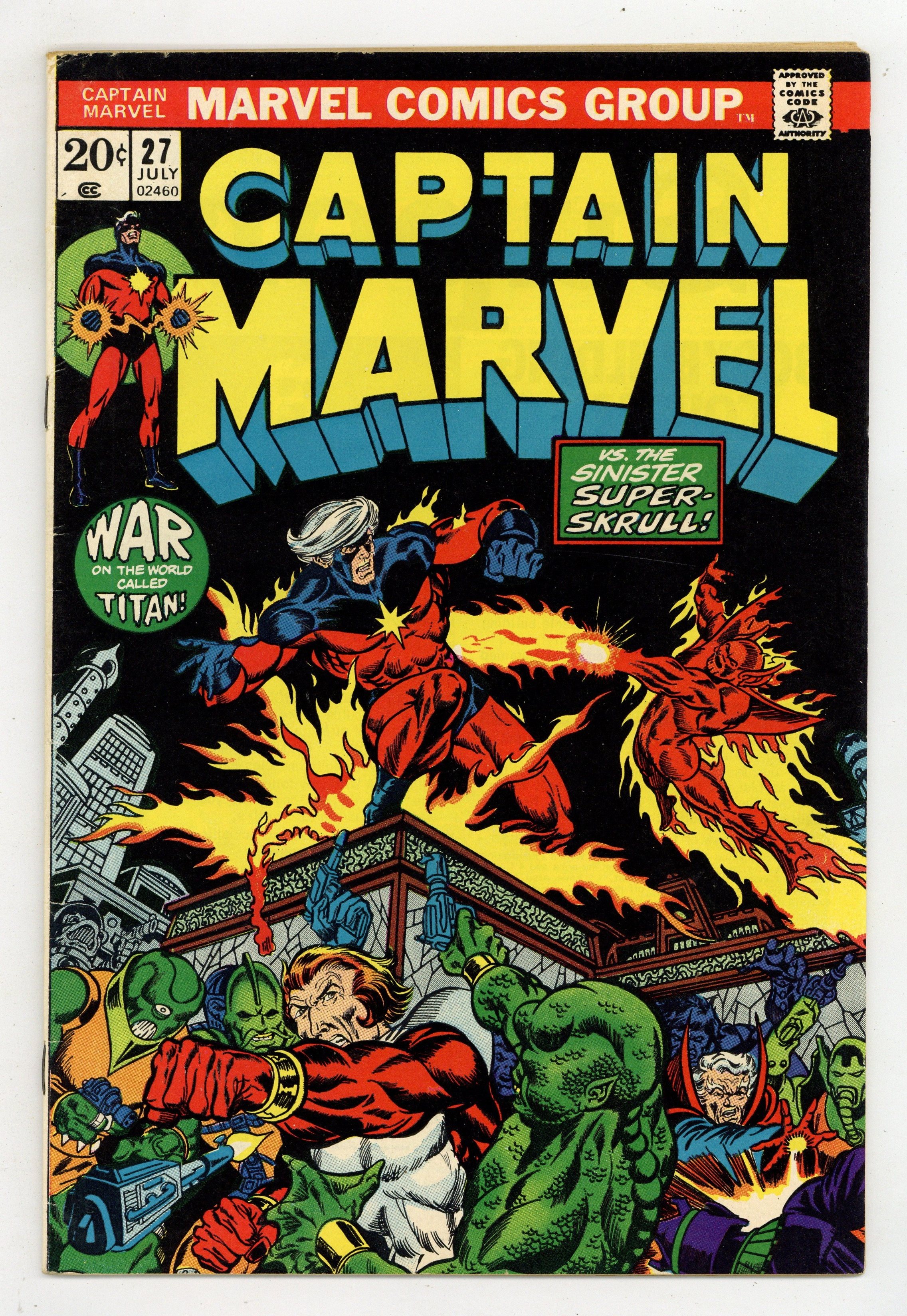 The Super-Skrull continues to pester Captain Marvel in "Trapped on Titan!" Script by Mike Friedrich, plot and pencils by Jim Starlin, inks by Pablo Marcos. Meanwhile, Thanos seeks out the Cosmic Cube. Cameos by the Thing (of the Fantastic Four), the Avengers (Captain America, Iron Man, the Scarlet Witch, the Vision, and the Black Panther), and Drax the Destroyer. This issue also contains a map of Titan. Cover price $0.20.