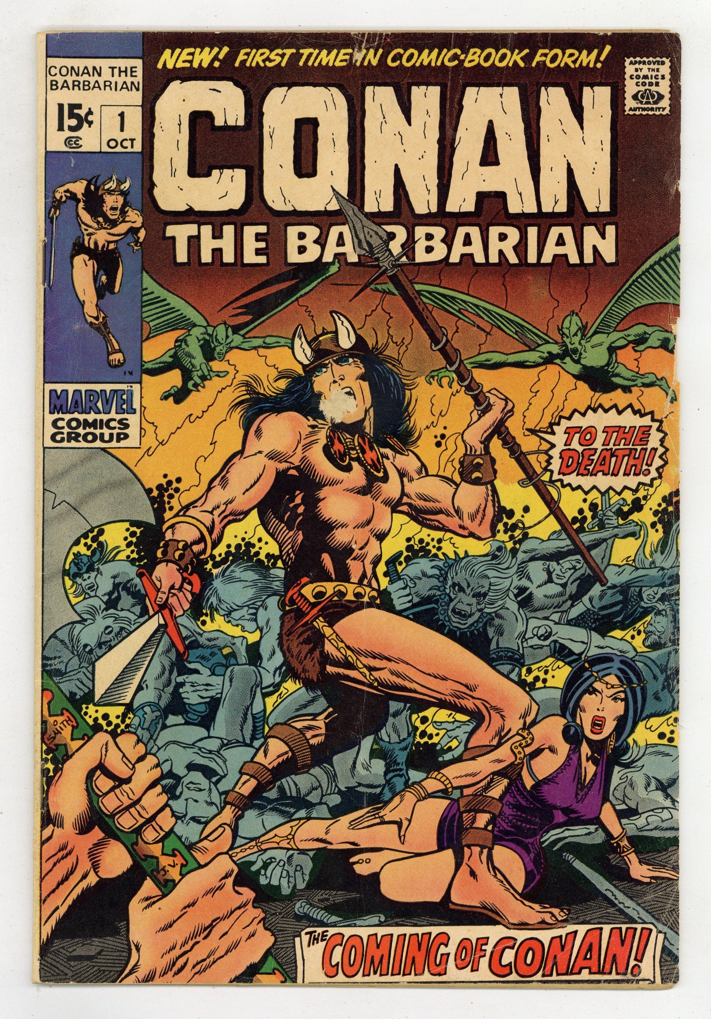 Cover pencils by Barry Windsor-Smith, inks by John Verpoorten. First comic book appearance and origin of Conan. The Coming of Conan!, script by Roy Thomas, pencils by Barry Windsor-Smith, inks by Dan Adkins; Conan battles at Vanaheim and sees his future; Tara returns to her dimension 1st comic book appearance of Kull (cameo). The letters page contains a map of Conan's world of the Hyborian Age drawn by Windsor-Smith (based on Robert E. Howard's own version) and a short essay on The World of Conan. 36 pgs. Cover price: $0.15. Cover price $0.15.