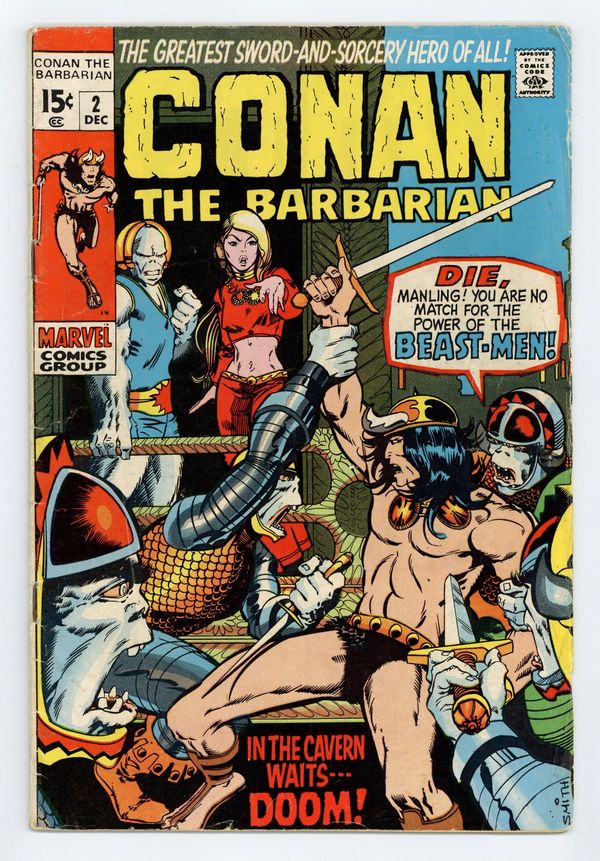 Cover art by Barry Windsor-Smith. Lair of the Beast-Men!, script by Roy Thomas, pencils by Barry Windsor-Smith, inks by Sal Buscema; Conan leads humans in a revolution against their ape-masters; Conan kills a snow-lion; Conan's 1st time in chains. Letters to the editor from writers Harlan Ellison, Dick Lupoff, August Derleth, and Ted White; comics historians Don and Maggie Thompson; and Glenn Lord. The letters page reprints the Hyborian Age map from Conan 1. 36 pgs. Cover price: $0.15. Cover price $0.15.