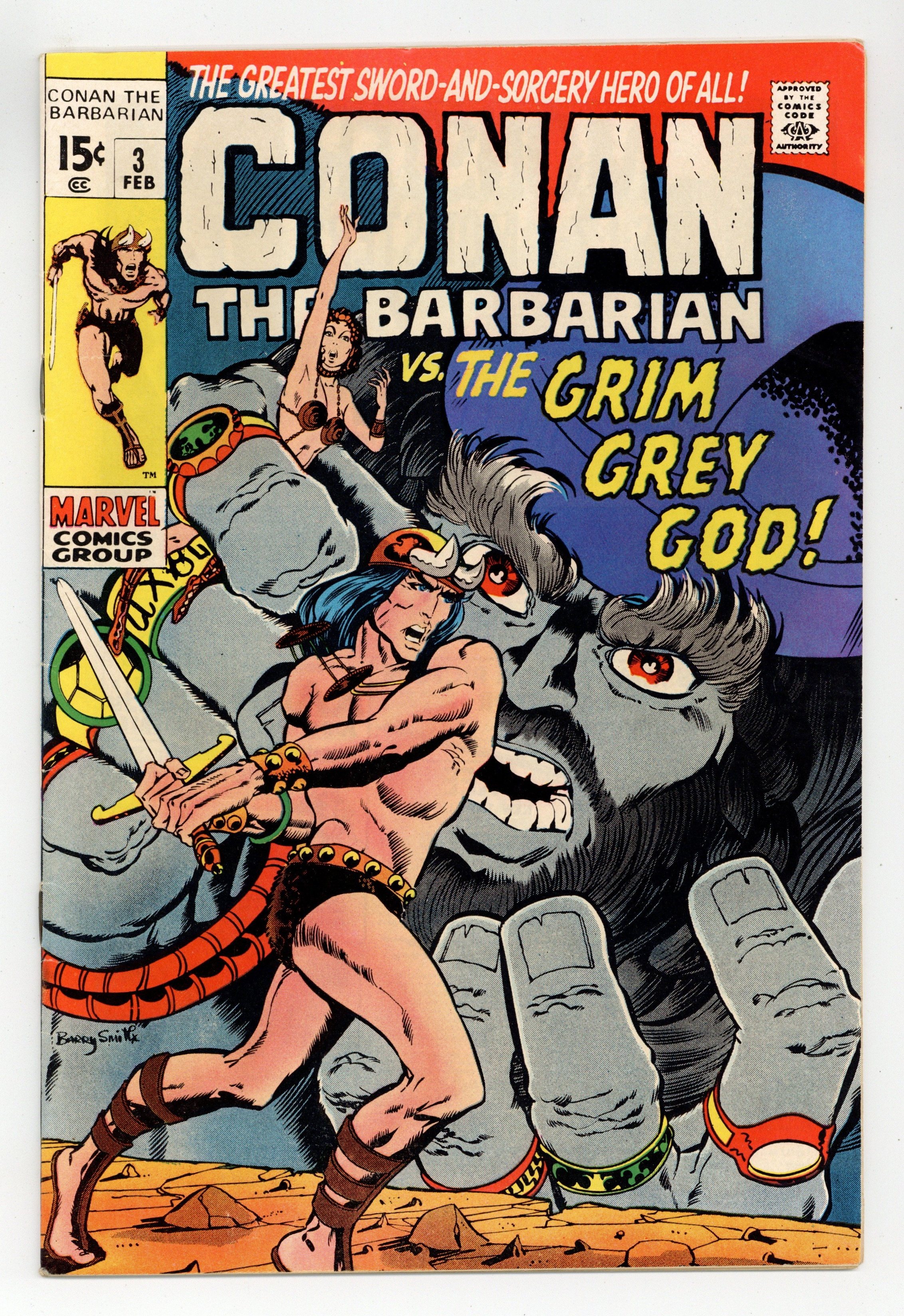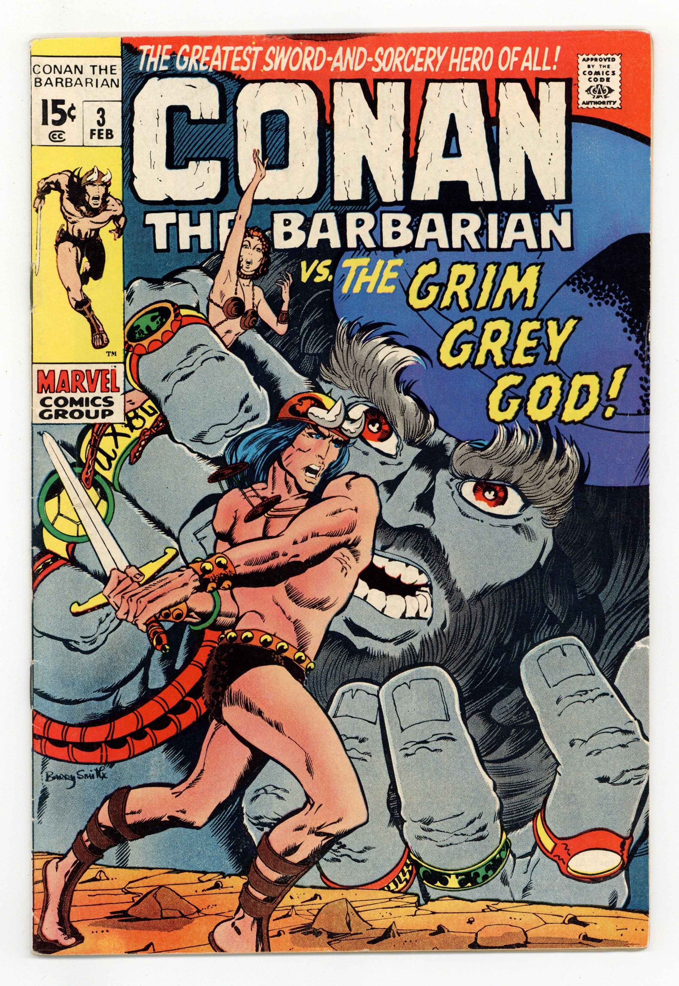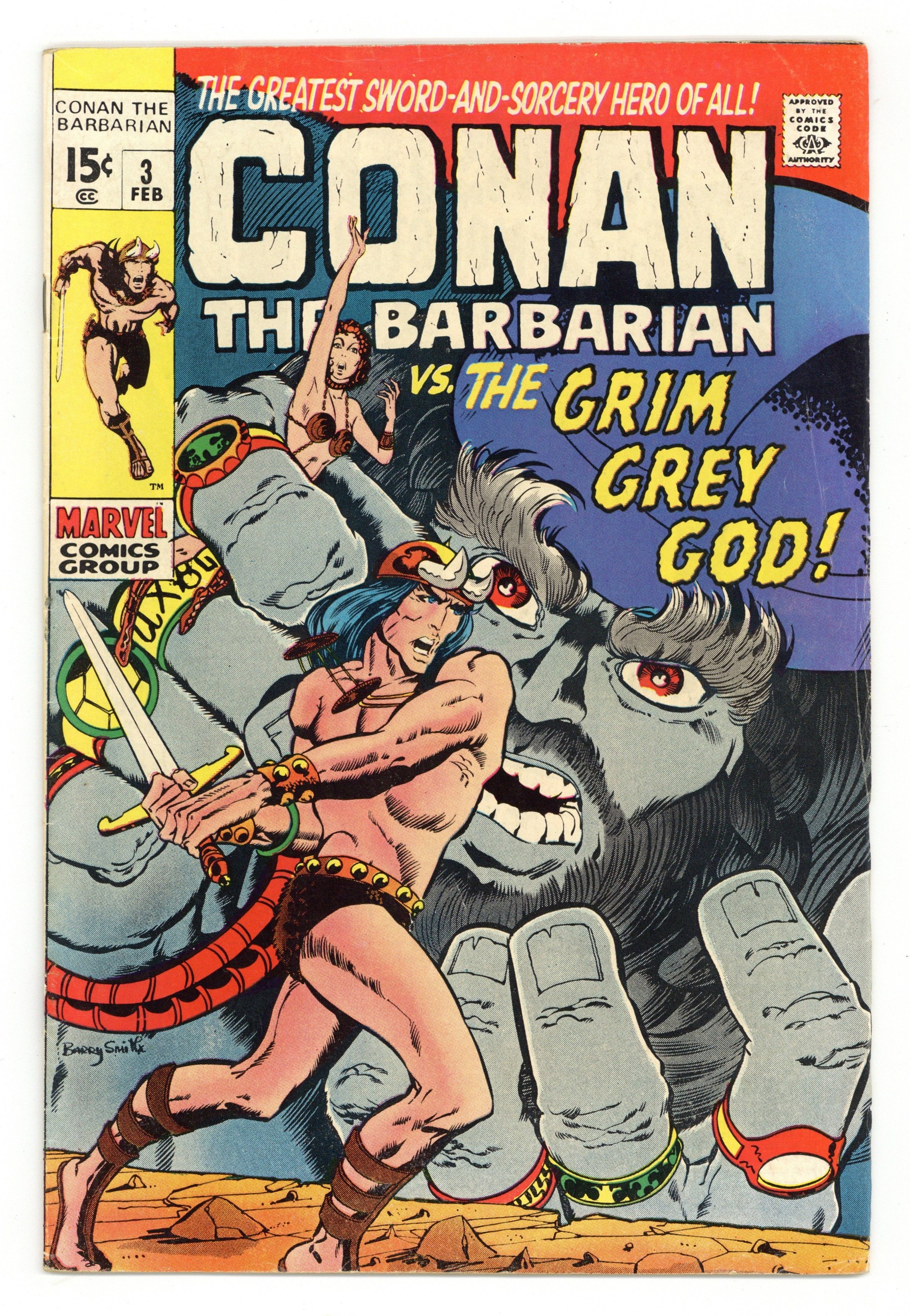 Cover art by Barry Windsor-Smith. The Twilight of the Grim Grey God!; script by Roy Thomas, pencils by Barry Windsor-Smith, inks by Sal Buscema; setting: Hyperborean/Brythunian battlefield; Conan converses with God Borri Borri, participates in a great and bloody battle, and kills Malachi; adapted from the non-Conan story, The Grey God Passes by Robert E. Howard. Rumored to have had lower distribution in some areas. The letters page reprints the Hyborian Age map from Conan 1. 36 pgs. Cover price: $0.15. Cover price $0.15.