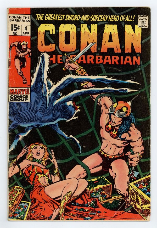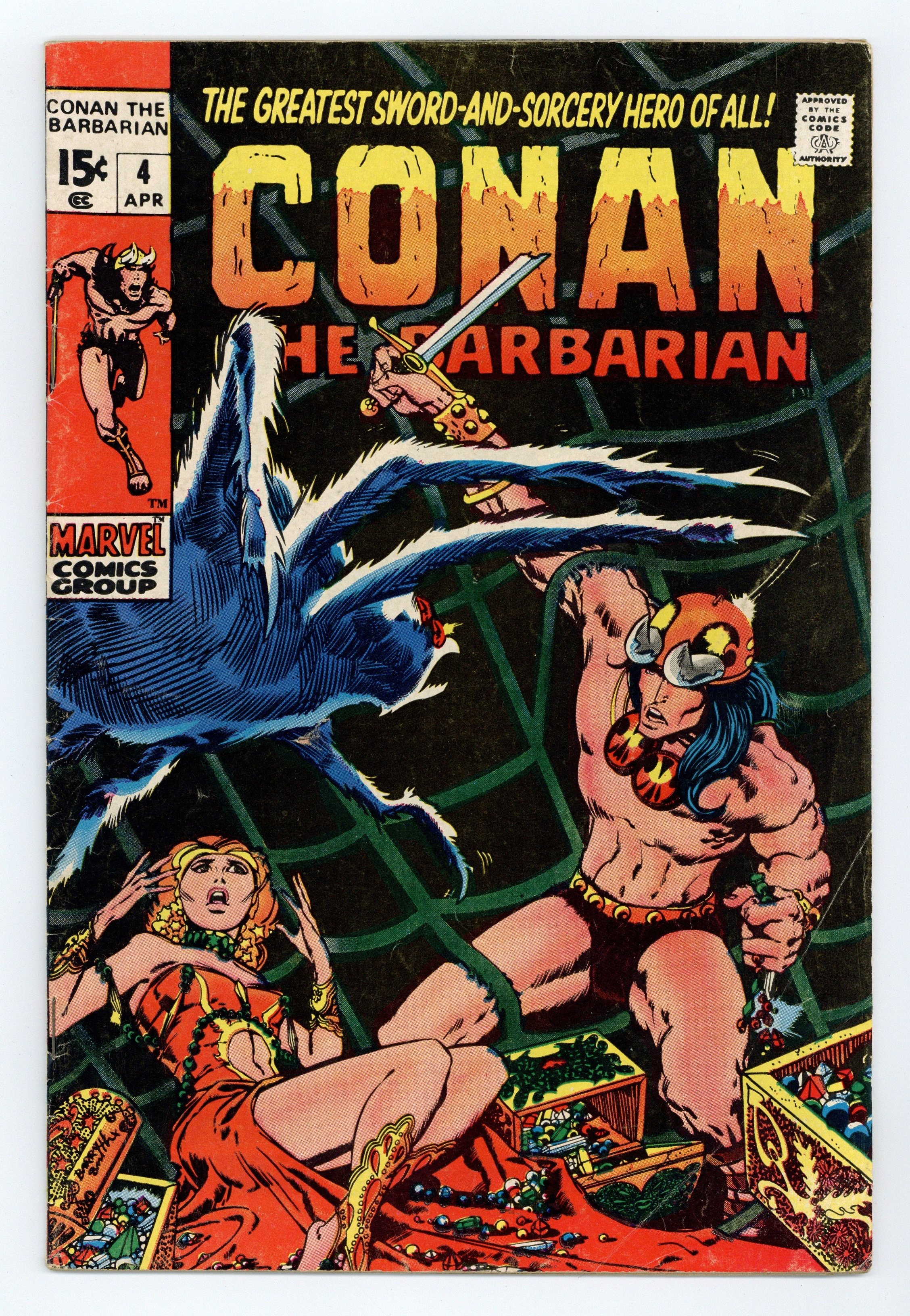 Cover art by Barry Windsor-Smith. The Tower of the Elephant!, script by Roy Thomas, pencils by Barry Windsor-Smith, inks by Sal Buscema; setting: City of Arenjun in Zamora; Conan scales Elephant tower, kills lion & giant spider, and saves Yag-Kosha by killing him at his request; adapted from the story by Robert E. Howard. 36 pgs. Cover price: $0.15. Cover price $0.15.