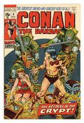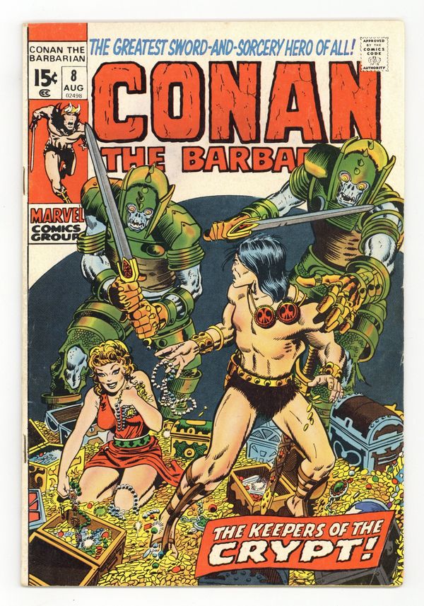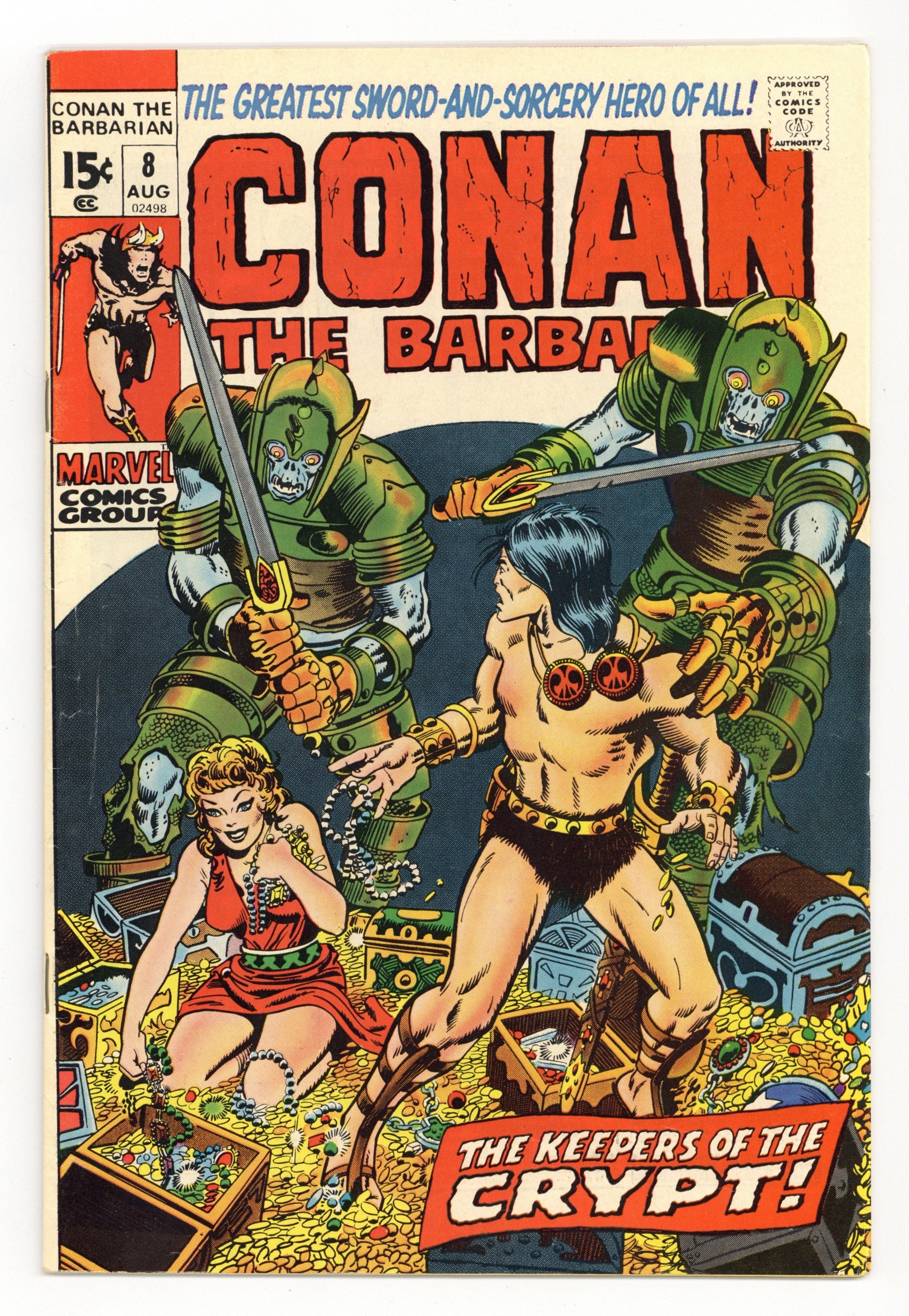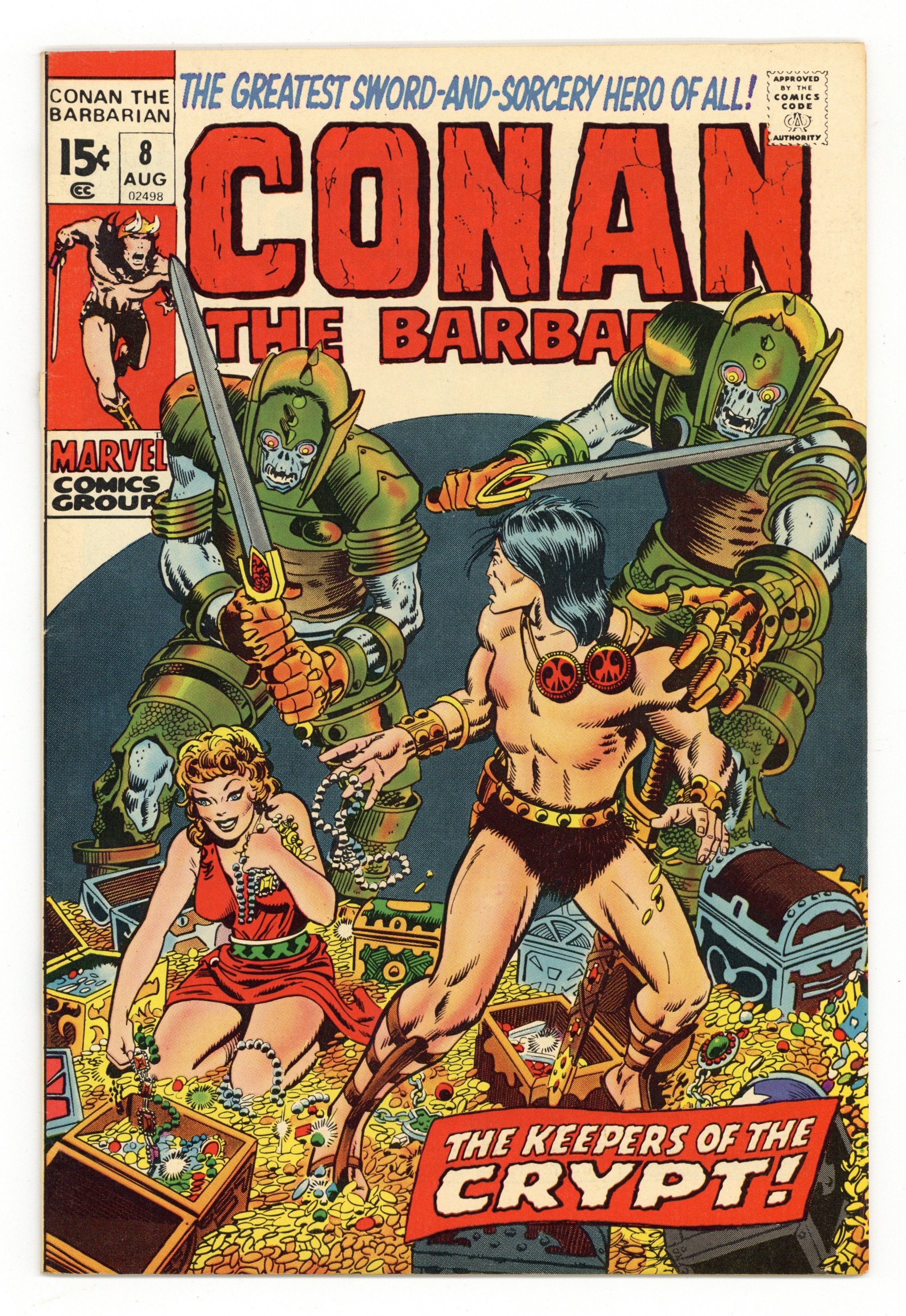 Cover art by Barry Windsor-Smith and John Romita (re-touches). The Keepers of the Crypt, script by Roy Thomas, pencils by Barry Windsor-Smith, inks by Tom Sutton and Tom Palmer; setting: Lost city of Lanjau; Conan battles a giant lizard & Undead creatures; Jenna & Conan flee village on horse at end of story; adapted from a synopsis by Robert E. Howard. The letters page reprints the Hyborian Age map from Conan 1. 36 pgs. Cover price: $0.15. Cover price $0.15.