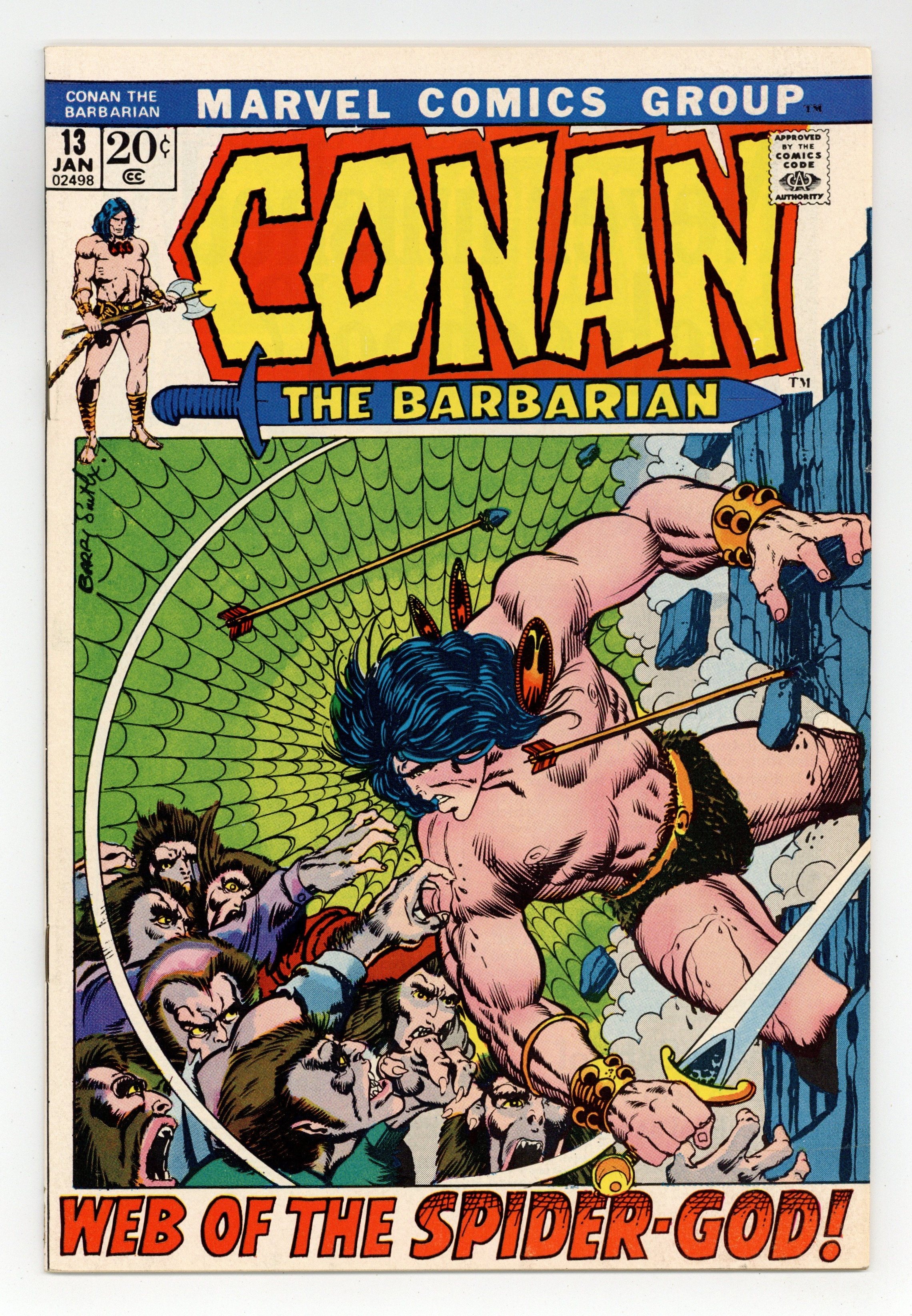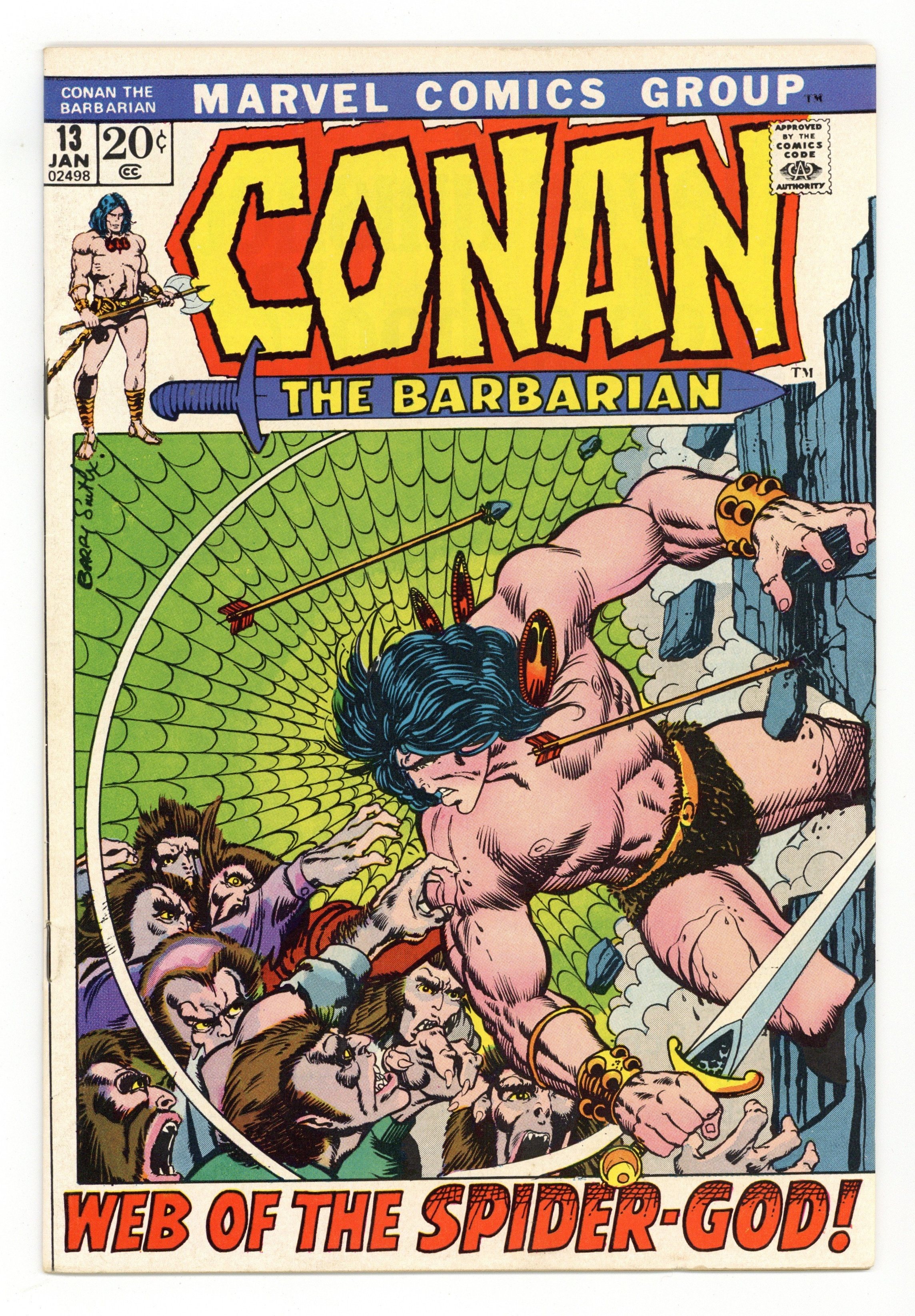 Cover art by Barry Windsor-Smith. Web of the Spider-God, plot by John Jakes, script by Roy Thomas, pencils by Barry Windsor-Smith, inks by Sal Buscema; setting: desert east of Ophir & city of Yezud; Conan is delirous in desert, Thanix saves his life; Conan fights Omm (giant spider), Tork destroys Yezud and leaves for Shadizar with Lea. 36 pgs. Cover price: $0.20. Cover price $0.20.