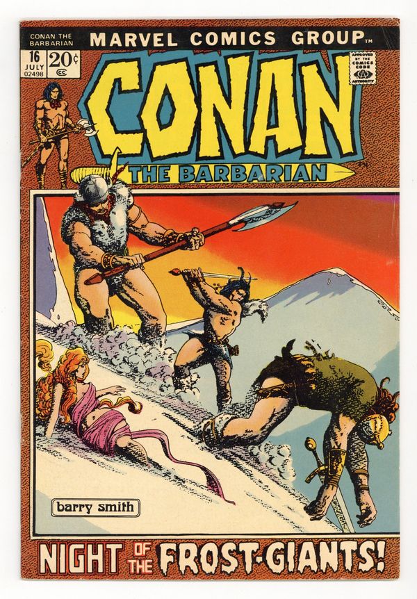 Cover art by Barry Windsor-Smith. The Frost Giant's Daughter, script by Roy Thomas, art by Barry Windsor-Smith; setting: Snowy battlefield; Conan chases Atali across the snow, slays her two frost giant brothers, and catches her; Her father, Ymir then takes her from Conan. This story originally appeared in Savage Tales 1, but for its publication here Windsor-Smith added another page (a new splash page), and some panels and dialogue were altered for Comics Code approval. Back-up reprint story: The Sword and the Sorcerers (from Chamber of Darkness 4), script by Roy Thomas, art by Windsor-Smith. Also in this issue: a full-page reprint of the Hyborian Age map from Conan 1. 36 pgs. Cover price $0.20. Cover price $0.20.