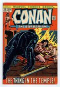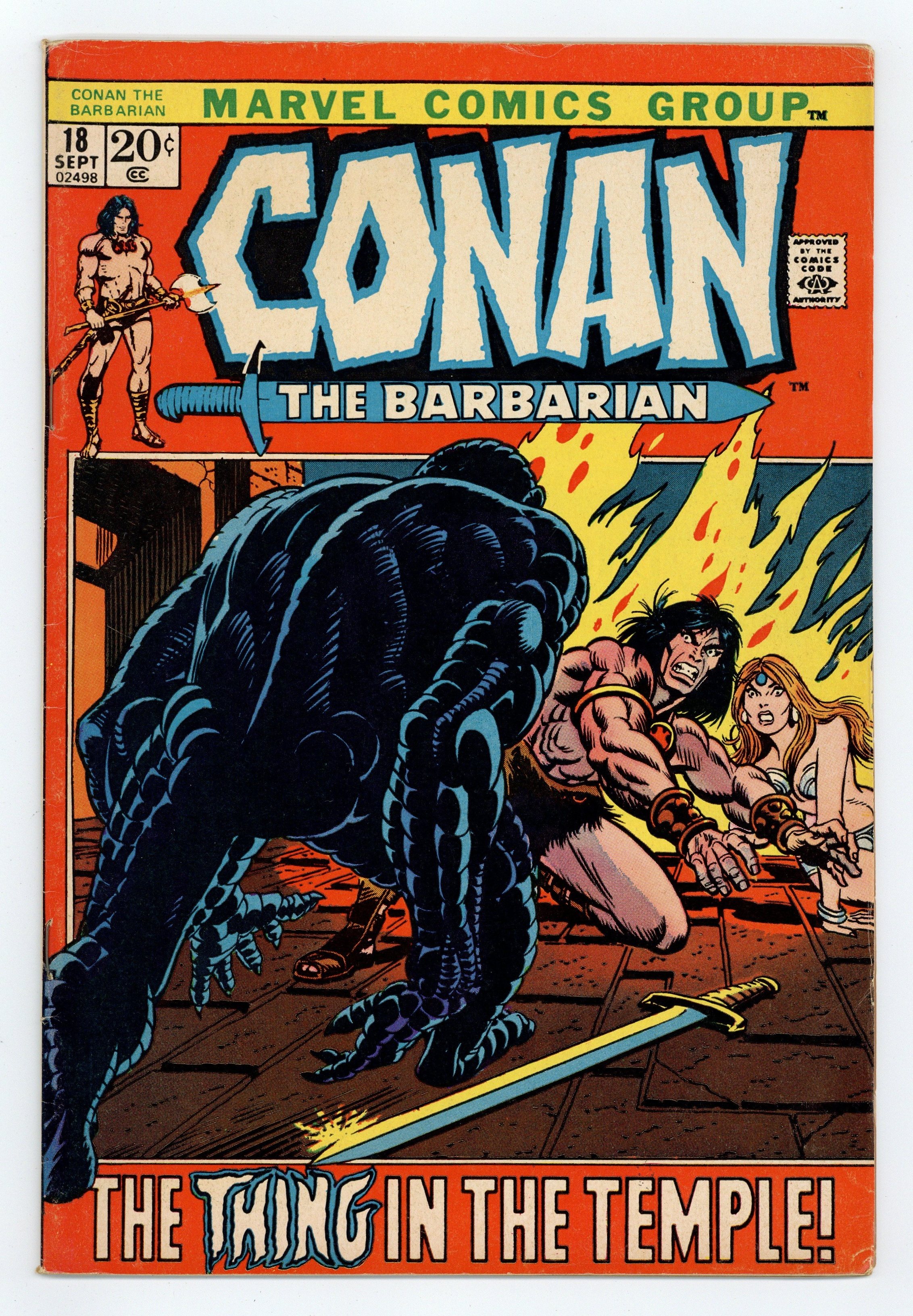 Cover pencils by Gil Kane, inks by John Romita. The Thing in the Temple, script by Roy Thomas, pencils by Gil Kane, inks by Dan Adkins; setting: Island city of Bal-Sagoth in Vilayet Sea; Conan & Fafnir slay demons and flee from Bal-Sagoth as a volcano destroys the island; They are picked up in the Sea by Yezdigerd; adapted from the non-Conan story, The Gods of Bal-Sagoth by Robert E. Howard; Fafnir appearance. Letter to the editor from Ted White (editor of Amazing, Fantastic). Kane cover pencils, John Romita Sr. cover inks. 36 pgs. Cover price $0.20. Cover price $0.20.