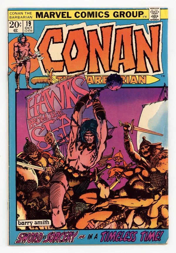 Tags: Marvel Legacy Numbering: Conan (part 19), Conan$9.30Cover art by Barry Windsor-Smith. Hawks From the Sea, script by Roy Thomas, pencils by Barry Windsor-Smith, inks (pages 1-9) by Dan Adkins. (Pages 10-20 were reproduced directly from the pencils); setting: Ship, City of Makkalet; Conan works for Turanian military and lays seige to Makkalet; Legend of the Living Tarim is told; Conan makes enemy of Balthaz; Fafnir is wounded by flaming arrow. 36 pgs. Cover price $0.20. Cover price $0.20.