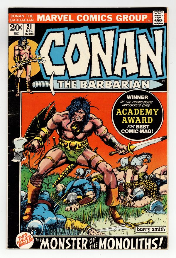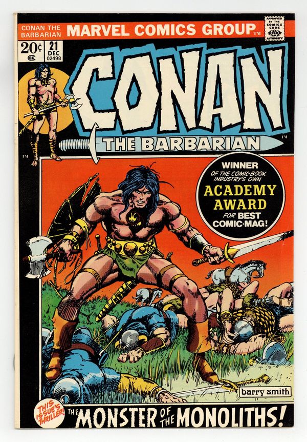 Tags: Marvel Legacy Numbering: Conan (part 21), Conan$16.25Cover art by Barry Windsor-Smith. The Monster of the Monoliths, script by Roy Thomas, breakdowns by Barry Windsor-Smith, pencils by Craig Russell and Val Mayerik; inks by Dan Adkins and Sal Buscema; setting: Makkalet; Conan is taken captive in Makkalet when he defects from the Turanian army; Conan joins and is betrayed by Makkalet forces; Conan fights giant toad-god; adapted in part from the story "The Black Stone" by Robert E. Howard. Letters to the editor from Dean Mullaney (Eclipse Comics) and comics artist Duffy Vohland. 36 pgs. Cover price $0.20. Cover price $0.20.