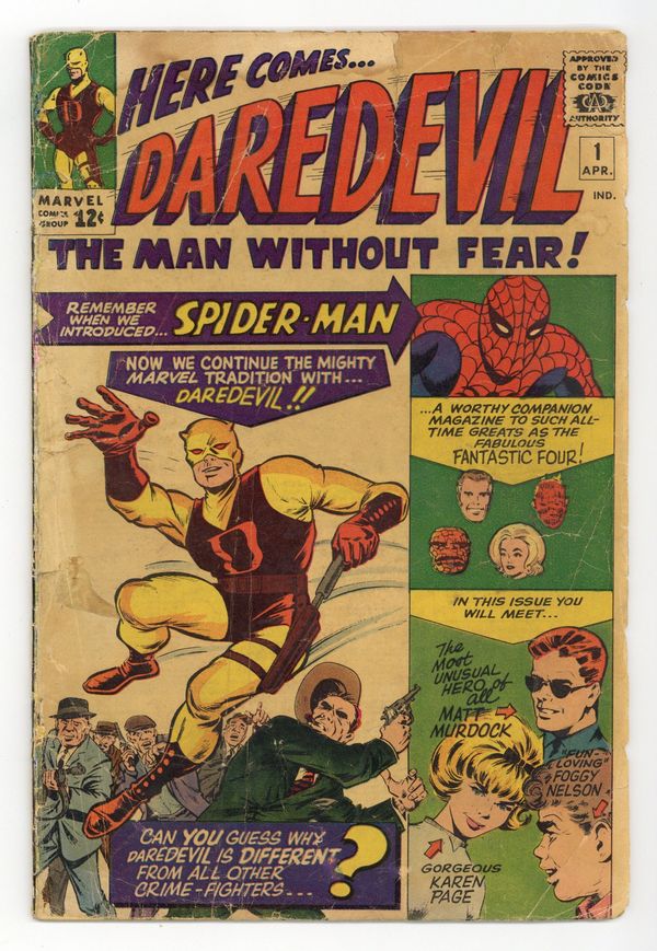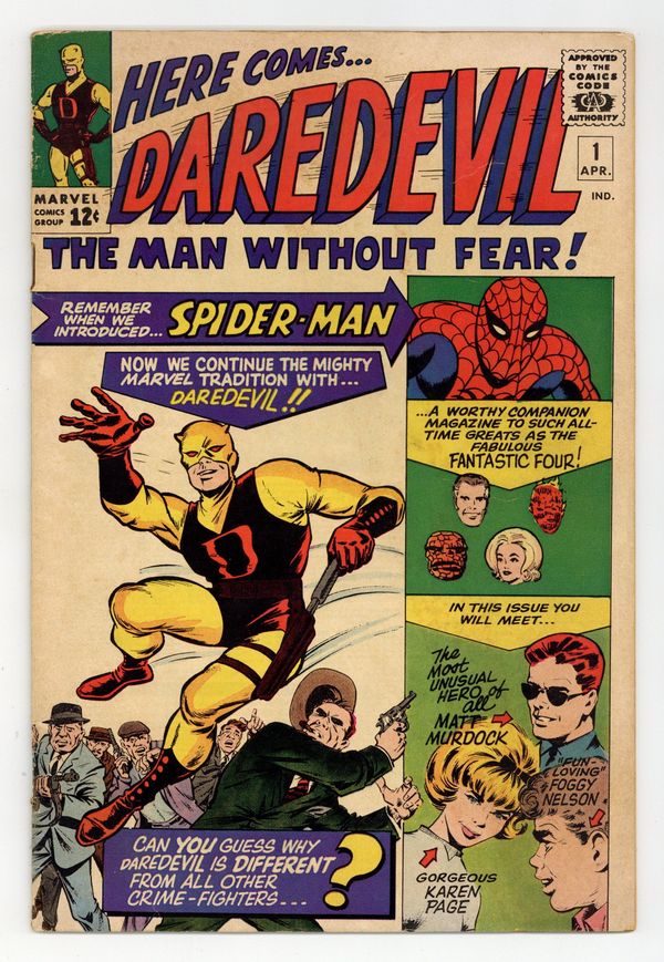 Cover pencils by Jack Kirby, inks by Bill Everett. First appearances of Daredevil, Karen Page, and Foggy Nelson in The Origin of Daredevil, script by Stan Lee, art by Bill Everett (splash page penciled by Jack Kirby); Matt Murdock saves a blind man from an oncoming truck but is struck blind himself by a radioactive canister during the rescue; The radioactivity heightens Matt's other senses and gives him an uncanny radar sense; Matt graduates college and begins practicing law with his college roommate Foggy; Matt's father, a boxer, is killed by the Fixer after he refuses to throw a fight; Matt designs a costume and a billy club (from his cane) and takes his derogatory childhood nickname "Daredevil"; DD tracks down the Fixer and the man who shot his father. Spider-Man and Fantastic Four appear on the cover but not in the story inside. 36 pgs. Cover price $0.12. Cover price $0.12.