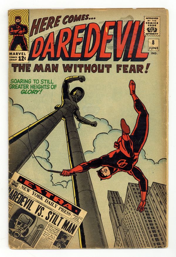 Cover art by Wally Wood. First appearance of the Stilt-Man in The Stilt-Man Cometh!, script by Stan Lee, art and cover by Wally Wood; Nelson and Murdock are hired by a disgruntled scientist who claims his boss stole his invention; The scientist turns out, not only to be the real thief, but also the new villain, Stilt-Man. House ad for Fantastic Four #40 and Amazing Spider-Man #26. Letter by artist Alan Hutchinson. 36 pgs. Cover price $0.12. Cover price $0.12.