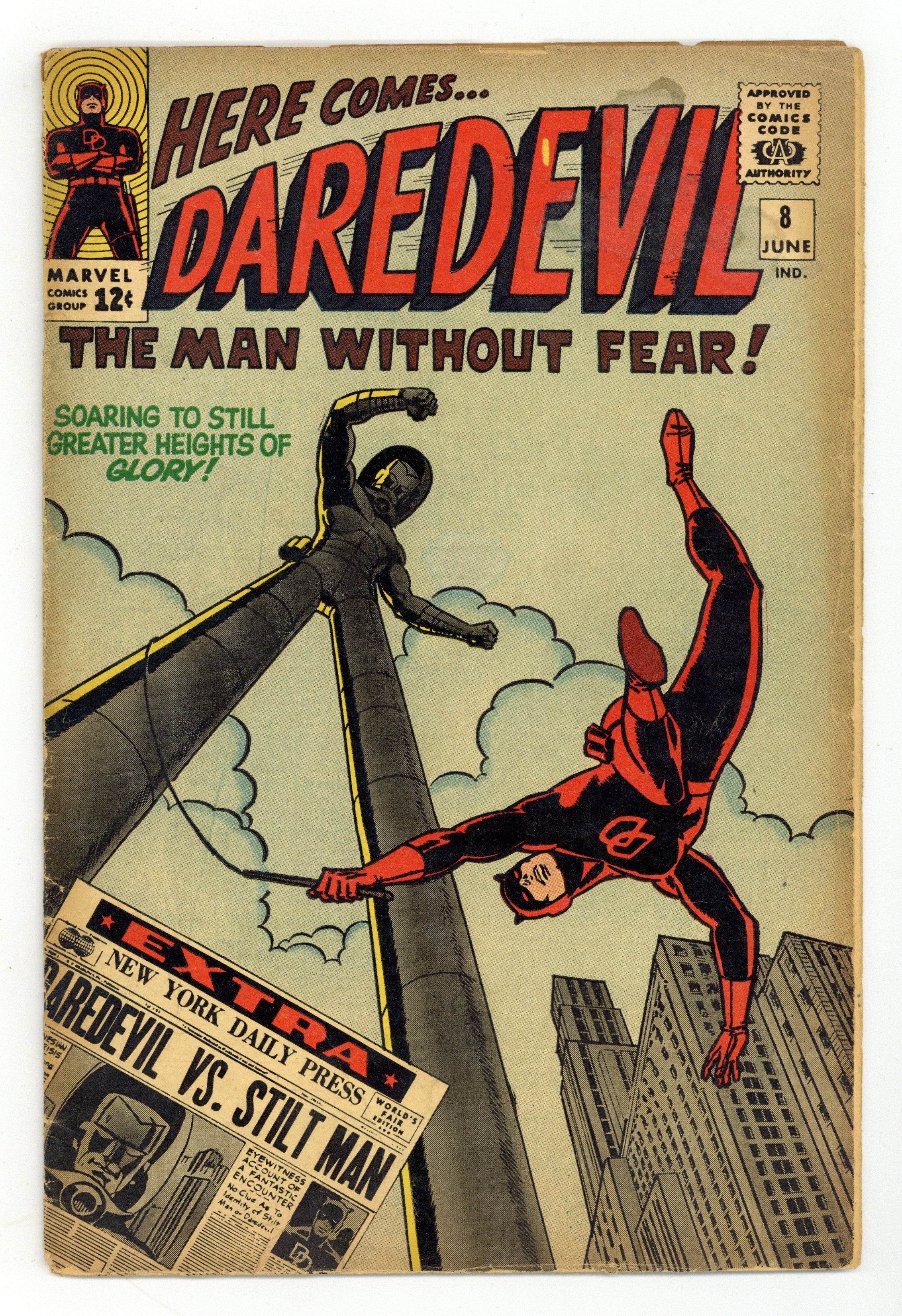 Starts May 11 Cover art by Wally Wood. First appearance of the Stilt-Man in The Stilt-Man Cometh!, script by Stan Lee, art and cover by Wally Wood; Nelson and Murdock are hired by a disgruntled scientist who claims his boss stole his invention; The scientist turns out, not only to be the real thief, but also the new villain, Stilt-Man. House ad for Fantastic Four #40 and Amazing Spider-Man #26. Letter by artist Alan Hutchinson. 36 pgs. Cover price $0.12. Cover price $0.12.